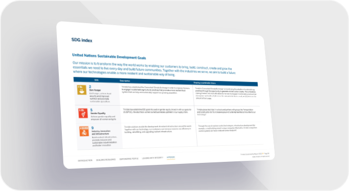 SDG index United Nations Sustainable Development Goals Our mission is to transform the way the world works by enabling our customers to bring, build, construct, create and grow the essentials we need to live every day and build future communities. Together with the industries we serve, we aim to build a future where our technologies enable a more resilient and sustainable way of living. SDG Description Shaping a sustainable future 2 Trimble has established the Connected Climate Exchange in order to empower farmers Trimble’s Connected Climate Exchange1 is incentivizing the adoption of sustainable ag Zero Hunger to engage in sustainable agricultural practices that promote a more resilient food practices through the opportunity to generate and sell carbon credits. This is therefore system that can fully and sustainably support our growing population. making it easier and more a昀昀ordable for farmers to engage in sustainable practices that End hunger, achieve food (1) improve soil health, (2) decrease the amount of fertilizers used, and (3) decrease the security and improved amount of fuel usage. nutrition and promote sustainable agriculture. Trimble has established DEI goals focused on gender equity (mixed in with our goals for Trimble places tech labs2 5 in schools and partners with groups like Transportation Gender Equality US BIPOC). We also track women owned businesses upstream in our supply chain. and Construction Girl to increase exposure of underrepresented communities to our 3 technology . Achieve gender equality and empower all women and girls 9 Trimble solutions enable the development of resilient infrastructure around the world. Through the use of machine control technologies, infrastructure development (for Industry, Innovation Together with our technology, our customers can increase resource-use e昀케ciency in example, a road building project using a compactor 昀椀tted with a Trimble compaction 4 and Infrastructure building, retro昀椀tting, and upgrading resilient infrastructure. control system) can have a reduced carbon footprint . Build resilient infrastructure, promote inclusive and sustainable industrialization and foster innovation INTRODUCTION BUILDING RESILIENCE EMPOWERING PEOPLE LEADING WITH INTEGRITY APPENDIX Trimble Sustainability Report 2022 Page 56 ©2023, Trimble Inc. All rights reserved.