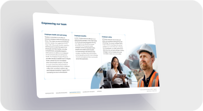 Empowering our team Employee health and well-being Employee bene昀椀ts Employee safety Trimble is committed to providing an In 2022, Trimble enhanced o昀昀erings in our All Trimble employees are provided with inclusive workplace where all employees can global bene昀椀ts package. In the United States safety and compliance training during their thrive. This means we ensure all employees we introduced enhanced gender a昀케rming onboarding. This ensures workplace safety and their families feel supported at every care, aligned to the World Professional is top of mind in everything we do, and our stage of life. We provide bene昀椀ts, programs Association for Transgender Health employees are safe in their roles at Trimble. and resources to meet the needs of our standards, introduced equitable fertility For US employees, our safety performance employees and their families, including bene昀椀ts and created speci昀椀c bene昀椀ts data shows how we trend well below industry comprehensive, accessible programs for those caring for neurodiverse family averages in terms of injuries with a total and resources to address our employees’ members. Our ERNs were instrumental in recordable incident rate of 0.1 in 2022. needs in mental, physical and 昀椀nancial partnering with our bene昀椀ts team to identify, health. Our Employee Support Program research and implement these new bene昀椀ts provides clinically accepted tools to mitigate across the organization. stress, prevent burnout and address other mental health concerns. We work to create connection and teamwork on health by implementing 昀椀tness challenges, co昀昀ee chats, providing a wellness app and Employee Assistance Program (EAP) counseling services to all employees. INTRODUCTION BUILDING RESILIENCE EMPOWERING PEOPLE LEADING WITH INTEGRITY APPENDIX Trimble Sustainability Report 2022 Page 32 ©2023, Trimble Inc. All rights reserved.