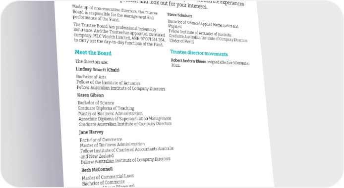 Looking out for your interests The directors of the Trustee Board have a variety of work and life experiences which help them represent and look out for your interests. Made up of non-executive directors, the Trustee Steve Schubert Board is responsible for the management and Bachelor of Science (Applied Mathematics and performance of the Fund. Physics) The Trustee Board has professional indemnity Fellow Institute of Actuaries of Australia insurance. And the Trustee has appointed its related Graduate Australian Institute of Company Directors company, MLC Wealth Limited, ABN 97 071 514 264, (Order of Merit) to carry out the day-to-day functions of the Fund. Meet the Board Trustee director movements Robert Andrew Blooreresigned effective 9 December The directors are: 2022. Lindsay Smartt (Chair) Bachelor of Arts Fellow of the Institute of Actuaries Fellow Australian Institute of Company Directors Karen Gibson Bachelor of Science Graduate Diploma of Teaching Master of Business Administration Associate Diploma of Superannuation Management Graduate Australian Institute of Company Directors Jane Harvey Bachelor of Commerce Master of Business Administration Fellow Institute of Chartered Accountants Australia and New Zealand Fellow Australian Institute of Company Directors Beth McConnell Master of Commercial Laws Bachelor of Commerce Bachelor of Laws (Honours) Diploma of Superannuation Management Graduate Australian Institute of Company Directors 8 | MLC Super Fund 2023 Annual Report