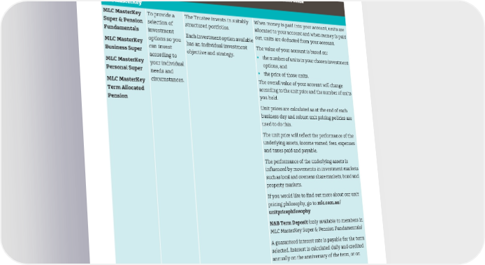 How your money is invested Product name Investment Investment strategy About your account value objective MLC MasterKey MLC MasterKey To provide a The Trustee invests in suitably When money is paid into your account, units are Super & Pension selection of structured portfolios. allocated to your account and when money is paid Fundamentals investment Each investment option available out, units are deducted from your account. MLC MasterKey options so you has an individual investment The value of your account is based on: Business Super can invest objective and strategy. the number of units in your chosen investment according to options, and MLC MasterKey your individual Personal Super needs and the price of those units. MLC MasterKey circumstances. The overall value of your account will change Term Allocated according to the unit price and the number of units Pension you hold. Unit prices are calculated as at the end of each business day and robust unit pricing policies are used to do this. The unit price will reflect the performance of the underlying assets, income earned, fees, expenses and taxes paid and payable. The performance of the underlying assets is influenced by movements in investment markets such as local and overseas share markets, bond and property markets. If you would like to find out more about our unit pricing philosophy, go to mlc.com.au/ unitpricephilosophy NAB Term Deposit (only available to members in MLC MasterKey Super & Pension Fundamentals) A guaranteed interest rate is payable for the term selected. Interest is calculated daily and credited annually on the anniversary of the term, or on maturity. Early withdrawals are only permitted in extreme circumstances and will result in reduced interest. MLC Super Fund 2023 Annual Report | 15