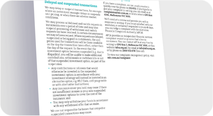 Some things you should know your superannuation. For more information go to Resolving complaints ato.gov.au If you have a complaint, we can usually resolve it Delayed and suspended transactions quickly over the phone on 132 652.If you’d prefer to put your complaint in writing, you can email us at We may delay or suspend transactions, for example complaints@mlc.com.au,or send a letter to GPO Box where an investment manager delays or suspends 4341, Melbourne VIC 3001. unit pricing, or when there are adverse market We’ll conduct a review and provide you with a conditions. response in writing. If you’re not satisfied with our We may process withdrawal and switch requests in resolution, or we haven’t responded to you in 45 days, instalments over a period of time and may also you can lodge a complaint with the Australian suspend processing of withdrawal and switch Financial Complaints Authority (AFCA). requests we have received. In certain circumstances AFCA provides an independent financial services we may refuse a request. Where requests are delayed, complaint resolution process that’s free to suspended or being paid in instalments, the unit consumers. You can contact AFCA at any time by prices used for transactions will be those available writing to GPO Box 3, Melbourne VIC 3001, at their on the day the transaction takes effect, rather than website (afca.org.au), by email at info@afca.org.au, the day of the request. In the event that the or by phone on 1800 931 678 (free call). investment option becomes suspended (e.g. due to To view our complaints management policy, visit illiquidity), you will be unable to make additional mlc.com.au/complaint contributions, withdrawals or switches into or out of that suspended investment option. As part of the suspension: Any contributions or rollovers that would otherwise be invested in the suspended investment option in accordance with your investment strategy will instead be invested in an alternative option, e.g. MLC Cash, until you provide us with alternative instructions; Any insurance cover you hold may cease if there are insufficient monies in your non-suspended investment options to cover the cost of the insurance; and You may only withdraw your funds in accordance with any withdrawal offer that we make. We are not responsible for losses that delayed or suspended transactions may cause. MLC Super Fund 2023 Annual Report | 11