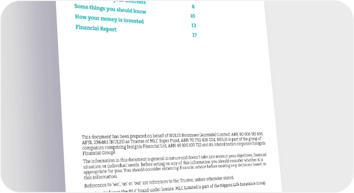 Contents A message from the Chair 5 Looking out for your interests 8 Some things you should know 10 How your money is invested 13 Financial Report 17 This document has been prepared on behalf of NULIS Nominees (Australia) Limited, ABN 80 008 515 633, AFSL 236465 (NULIS) as Trustee of MLC Super Fund, ABN 70 732 426 024. NULIS is part of the group of companies comprising Insignia Financial Ltd, ABN 49 100 103 722 and its related bodies corporate (Insignia Financial Group). The information in this document is general in nature and doesn’t take into account your objectives, financial situation or individual needs. Before acting on any of this information you should consider whether it is appropriate for you. You should consider obtaining financial advice before making any decisions based on this information. References to ‘we’, ‘us’ or ‘our’ are references to the Trustee, unless otherwise stated. MLC Limited uses the MLC brand under licence. MLC Limited is part of the Nippon Life Insurance Group and is not a part of the Insignia Financial Group. Subject to super law, the final authority on any issue relating to your account is the Fund's Trust Deed, and the relevant insurance policy, which governs your rights and obligations as a member. Past performance is not a reliable indicator of future performance. Any projection or other forward looking statement ('Projection') in this document is provided for information purposes only. No representation is made as to the accuracy or reasonableness of any such Projection or that it will be met. Actual events may vary materially. An online copy of this document is available atmlc.com.au/annualreports MLC Super Fund 2023 Annual Report | 3