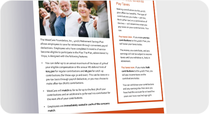 2023 Benefits Guide 401(k) Retirement Savings Plan You Choose When to Pay Taxes Making contributions to the 401(k) plan offers tax benefits. The type of contributions you make —pre-tax, Roth (after-tax) or a combination of the two —will determine when you pay taxes on your contributions. You can: Pay taxes later. If you make pre-tax contributions to the 401(k) Plan, you The WestCareFoundation, Inc., 401(k) Retirement Savings Plan will lower your taxes today. allows employees to save for retirement through convenient payroll deductions. Employees who have completed 6 months of service The money you contribute, and any become eligible to participate in the Plan The Plan, administered by earnings will not be subject to income Voya, is designed with the following features: taxes until you withdraw it, likely in retirement. • You can defer up to an annual maximum of the lesser of 50% of your eligible compensation or the annual IRS deferral limit of Pay taxes now. If you make Roth $20,500 for regular contributions and $6,500 for catch-up contributions to the 401(k) Plan, you contributions (for those age 50 and over). This can be done on a will pay income taxes on the pre-tax basis through payroll deduction, or you may choose to contributions today. make after-tax (Roth) contributions. You can withdraw your contributions • WestCarewill match$1 for $1 for up to the first 3% of your and any earnings tax-free once you contributions and an additional $.50 for each $1 contributed for have had the account for at least five the next 2% of your contributions. years and have reached age 59½. • Employees are immediately vested in 100% of the company match. Not Enrolled? Get Started Today Online Phone 1. Go to https://enroll.voya.com 1. Call (888) 311-9487, Monday through 2. Enter plan number 81F805 Friday, 8 a.m. – 9 p.m. ET 3. Enter verification number 81F80599 Be sure to review the disclosures in the Important Information section during online enrollment. If enrolling by phone, you’ll be asked to verify you have reviewed the enrollment booklet. 29 WestCare