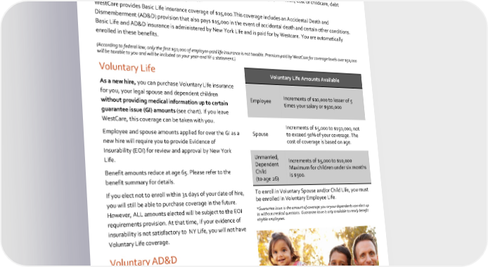 2023 Benefits Guide Life Insurance Basic Life/AD&D Having appropriate life insurance coverage is a critical part of planning for your family’s current and future financial needs. Proceeds from life insurance can help with salary replacement, mortgage protection, cost of childcare, debt repayment and children’s education expenses. WestCareprovides Basic Life insurance coverage of $15,000.This coverage includes an Accidental Death and Dismemberment (AD&D) provision that also pays $15,000 in the event of accidental death and certain other conditions. Basic Life and AD&D insurance is administered by New York Life and is paid for by Westcare. You are automatically enrolled in these benefits. (According to federal law, only the first $50,000 of employer-paid life insurance is not taxable. Premium paid by WestCare for coverage levels over $50,000 will be taxable to you and will be included on your year-end W-2 statement.) Voluntary Life Voluntary Life Amounts Available As a new hire, you can purchase Voluntary Life insurance for you, your legal spouse and dependent children Employee Increments of $10,000 to lesser of 5 without providing medical information up to certain times your salary or $500,000 guarantee issue (GI) amounts (see chart). If you leave WestCare, this coverage can be taken with you. Increments of $5,000 to $150,000, not Employee and spouse amounts applied for over the GI as a Spouse to exceed 50% of your coverage. The new hire will require you to provide Evidence of cost of coverage is based on age. Insurability (EOI) for review and approval by New York Life. Unmarried, Increments of $5,000 to $10,000 Dependent Maximum for children under six months Benefit amounts reduce at age 65. Please refer to the Child is $500. benefit summary for details. (to age 26) If you elect not to enroll within 31 days of your date of hire, To enroll in Voluntary Spouse and/or Child Life, you must you will still be able to purchase coverage in the future. be enrolled in Voluntary Employee Life. However, ALL amounts elected will be subject to the EOI *Guarantee issue is the amount of coverage you or your dependents can elect up to without medical questions. Guarantee issue is only available to newly benefit requirements provision. At that time, if your evidence of eligible employees. insurability is not satisfactory to NY Life, you will not have Voluntary Life coverage. Voluntary AD&D Employees can also elect to purchase Employee, Spouse and Dependent Child Voluntary AD&D coverage in increments and maximums equal to the Voluntary Life benefits. Employees pay the full cost of Voluntary Life and Voluntary AD&D insurance on an after-tax basis. 22 WestCare