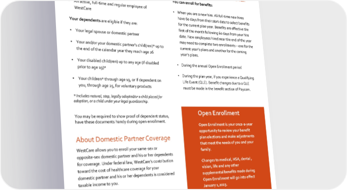 2023 Benefits Guide Eligibility and Enrollment Who is Eligible? When Can You Enroll in Benefits? Youare eligible for WestCare benefits if you are: You can enroll for benefits: • An active, full-time and regular employee of • When you are a new hire. All full-time new hires WestCare have 60 days from their start date to select benefits Your dependents are eligible if they are: for the current plan year. Benefits are effective the first of the month following 60 days from your hire • Your legal spouse or domestic partner date. New employees hired near the end of the year may need to complete two enrollments –one for the • Your and/or your domestic partner’s child(ren)* up to current year’s plans and another for the coming the end of the calendar year they reach age 26 year’s plans. • Your disabled child(ren) up to any age (if disabled • During the annual Open Enrollment period prior to age 19)* • During the plan year, if you experience a Qualifying • Your children* through age 19, or if dependent on Life Event (QLE). Benefit changes due to a QLE you, through age 25, for voluntary products must be made in the benefit section of Paycom. * Includes natural, step, legally adopted/or a child placed for adoption, or a child under your legal guardianship. You may be required to show proof of dependent status, Open Enrollment have these documents handy during open enrollment. Open Enrollment is your once-a-year opportunity to review your benefit About Domestic Partner Coverage plan elections and make adjustments WestCareallows you to enroll your same-sex or that meet the needs of you and your opposite-sex domestic partner and his or her dependents family. for coverage. Under federal law, WestCare’s contribution Changes to medical, HSA, dental , toward the cost of healthcare coverage for your vision, life and any other domestic partner and his or her dependents is considered supplemental benefits made during taxable income to you. Open Enrollment will go into effect Domestic partner premiums will be deducted on a post- January 1,2023. tax basis. You may wish to consult with a tax adviser for Flexible Spending Accounts run on a more information. calendar year. Open Enrollment for these plans is typically held in November with changes effective January 1. 4 WestCare