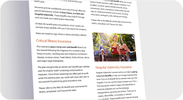 2023 Benefits Guide Optional Protection Benefits WestCareoffers additional voluntary benefit plans through Accident Insurance MetLife. These plans are not medical insurance and do not replace your medical coverage, but rather pay cash directly Accident insurance pays a cash benefit when you or your to you in addition to any benefits you receive from your covered family members suffer injuries sustained in an health plan. accident. Covered injuries include fractures, burns, concussions, tears, lacerations, broken teeth and eye Insurance policies available for purchase (through after-tax injuries. Additional benefits may be paid, including payroll deductions) include Critical Illness, Accident and ambulance, emergency care, testing and therapy. Hospital Indemnity.These benefits may help fill the gap until you meet your medical plan deductible. Please refer to the MetLife benefit plan summaries for details, and please visit Paycom for rates. All MetLife benefit plans are portable, which means you can take these benefits with you if you leave the company. Rates are based on age, tobacco status and policy elected. Critical Illness Insurance This insurance pays a lump-sum cash benefit directly to the insured following the diagnosis of a covered critical illness or event, including (but not limited to) Alzheimer’s disease, invasive cancer, heart attack, kidney failure, stroke and major organ transplants. The plan also provides an annual cash benefit (per calendar Hospital Indemnity Insurance year) for eligible health screenings and prevention measures. Since these screenings are often paid at 100% Hospital Indemnity insurance policy can help by paying under the medical plan, you could walk away with cash in lump-sum benefits to help you manage expenses that your pocket for practicing good preventive care. arise if you or an eligible family member ends up in the hospital. You can use the money however you’d like — Please refer to the MetLife benefit plan summaries for from paying for medical copays and deductibles to details, and please visit Paycom for rates. everyday expenses such as the mortgage, transportation, groceries and utilities. There are no copays, deductibles, coinsurance or network requirements. These benefits aren’t reduced because you receive a payment from any other coverage you have, such as Medical, Accident or Critical Illness Insurance. Please refer to the MetLife benefit plan summaries for details, and please visit Paycom for rates. 24 WestCare