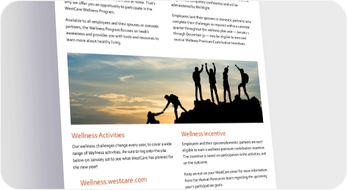 2023 Benefits Guide Wellness Program Participation in the program is voluntary and includes Our company’s strength and success depends on you, so your health and wellbeing is important to us. The everyday the completion of wellness activities. All aspects of the choices we make can help us live healthier, happier and program are completely confidential and will be more fulfilling lives — both at work and at home. That’s administered by WellRight. why we offer you an opportunity to participate in the WestCareWellness Program. Employees (and their spouses or domestic partners)who complete their challenges as required within a calendar Available to all employees and their spouses or domestic quarter throughout the wellness plan year —January 1 partners, the Wellness Program focuses on health throughDecember 31 —may be eligible to earn and awareness and provides you with tools and resources to receive Wellness Premium Contribution Incentives. learn more about healthy living. Wellness Activities Wellness Incentive Our wellness challenges change every year, to cover a wide Employees and their spouses/domestic partners are each range of Wellness activities. Be sure to log onto the site eligible to earn a wellness premium contribution incentive. below on January 1st to see what WestCare has planned for The incentive is based on participation in the activities, not the new year! on the outcome. Wellness.westcare.com Keep an eye on your WestCareemail for more information from the Human Resources team regarding the upcoming year's participation goals. Rewards for participating in WestCare’s Wellness Program are available to all employees and spouses/domestic partners covered under a WestCaremedical plan. If you think you might be unable to meet a standard for a reward under this wellness program, you might qualify for an opportunity to earn the same reward by different means. Contact the Benefits Department at [email protected], and we will work with you (and, if you wish, with your doctor) to find a wellness program with the same reward that is right for you considering your health status. 18 WestCare