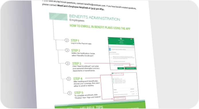 2023 Benefits Guide Enrolling with the Paycom App Download and install the Paycom app on your smart phone. Sign on to the Paycom app and select 2023 Benefits Enrollment under the Benefits Section. If you have any technical questions, contact [email protected]. If you have benefit-related questions, please contact WestCare’sEmployee HelpDeskat (323) 310-0834. 6 6 WestCare