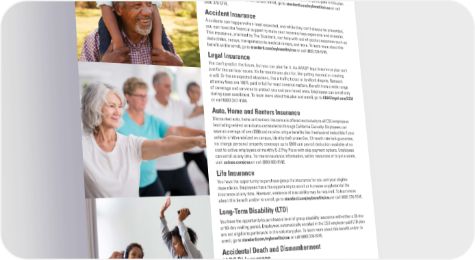 VOLUNTARY BENEFITS Critical Illness Group Critical Illness Insurance is offered through The Standard, which provides a lump-sum payment to cover out-of-pocket medical expenses and costs associated with life changes following the diagnosis of a covered critical illness. In addition, there are cash benefts for specifed health screenings. You and/or your spouse/registered domestic partner must be between the ages of 18-64 and enrolled in a health insurance plan to participate in this plan. To learn more about this beneft and/or enroll, go to standard.com/mybenefits/csu or call (800) 378-5745. Accident Insurance Accidents can happen when least expected, and while they can’t always be prevented, you can have the fnancial support to make your recovery less expensive and stressful. This insurance, provided by The Standard, can help with out-of-pocket expenses such as deductibles, copays, transportation to medical centers, and more. To learn more about this beneft and/or enroll, go to standard.com/mybenefits/csu or call (800) 378-5745. Legal Insurance ® You can’t predict the future, but you can plan for it. An ARAG legal insurance plan isn’t just for the serious issues. It’s for events you plan for, like getting married or creating a will. Or the unexpected situations, like a traffc ticket or landlord dispute. Network attorney fees are 100% paid in full for most covered matters. Beneft from a wide range of coverage and services to protect you and your loved ones. Employees can enroll only during open enrollment. To learn more about this plan and enroll, go to ARAGlegal.com/CSU or call (800) 247-4184. Auto, Home and Renters Insurance Discounted auto, home and renters insurance is offered exclusively to all CSU employees (excluding rehired annuitants and students) through California Casualty. Employees can save an average of over $500 and receive unique benefts like: free/waived deductible if your vehicle is hit/vandalized on campus, identity theft protection, 12-month rate lock guarantee, no charge personal property coverage up to $500 and payroll deduction available at no cost to active employees or monthly E-Z Pay Plans with skip payment options. Employees can enroll at any time. For more insurance information, safety resources or to get a quote, visit calcas.com/csu or call (866) 680-5142. Life Insurance You have the opportunity to purchase group life insurance for you and your eligible dependents. Employees have the opportunity to enroll or increase supplemental life insurance at any time. However, evidence of insurability may be required. To learn more about this beneft and/or to enroll, go to standard.com/mybenefits/csu or call (800) 378-5745. Long-Term Disability (LTD) You have the opportunity to purchase a level of group disability insurance with either a 30-day or 90-day waiting period. Employees automatically enrolled in the CSU employer-paid LTD plan are not eligible to participate in this voluntary plan. To learn more about this beneft and/or to enroll, go to standard.com/mybenefits/csu or call (800) 378-5745. Accidental Death and Dismemberment (AD&D) Insurance You are eligible to purchase group Accidental Death and Dismemberment (AD&D) insurance that covers you and your dependents in the event of death or dismemberment as a result of a covered accident. You may elect up to $1 million in coverage. Coverage for spouse/registered domestic partner and dependent child(ren) coverage are also available. To learn more about this beneft and/or to enroll, go to standard.com/mybenefits/csu or call (800) 378-5745. 15