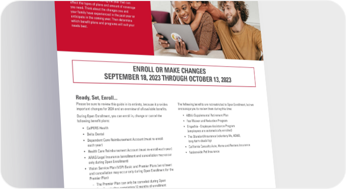 START PLANNING Open Enrollment is your annual opportunity to review your benefts, your family's needs and to fne-tune your benefts package to match. Many life events can occur during the year that can affect the types of plans and amount of coverage you need. Think about the changes you and your family have experienced in the past year or anticipate in the coming year. Then determine which beneft plans and programs will suit your needs best. ENROLL OR MAKE CHANGES SEPTEMBER 18, 2023 THROUGH OCTOBER 13, 2023 Ready, Set, Enroll... Please be sure to review this guide in its entirety, because it provides The following benefts are not restricted to Open Enrollment, but we important changes for 2024 and an overview of all available benefts. encourage you to review them during this time: During Open Enrollment, you can enroll in, change or cancel the • 403(b) Supplemental Retirement Plan following beneft plans: • Fee Waiver and Reduction Program • CalPERS Health • Empathia - Employee Assistance Program • Delta Dental (employees are automatically enrolled) • Dependent Care Reimbursement Account (must re-enroll • The Standard Insurance (voluntary life, AD&D, each year) long-term disability) • Health Care Reimbursement Account (must re-enroll each year) • California Casualty Auto, Home and Renters Insurance • ARAG Legal Insurance (enrollment and cancellation may occur • Nationwide Pet Insurance only during Open Enrollment) • Vision Service Plan (VSP) Basic and Premier Plans (enrollment and cancellation may occur only during Open Enrollment for the Premier Plan) − The Premier Plan can only be canceled during Open Enrollment after completing 12 months of enrollment • The Standard Critical and Accident Insurance 3