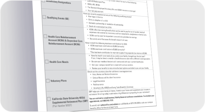 OPEN ENROLLMENT CHECKLIST TOPIC CHECKLIST Ensure your dependents are still eligible to participate. Spouse and Dependents • Is your dependent reaching the age of 26? You may be required to remove them soon. • Are they under 26? They are still eligible for benefts. Make sure all your benefciaries are up to date. Check for each of the following: • CalPERS Retirement Plan Benefciary Designations • 403(b), 457, 401(k) • The Standard Employer/Voluntary (life and AD&D insurance coverage) • Your last pay warrant Have you recently experienced any of the following qualifying events? • Marriage or divorce Qualifying Events (QE) • Birth or adoption of a child • Domestic partnership or resolution of partnership • Death of a spouse/partner/child • HCRA offers tax-saving benefts that can be used to pay for out-of-pocket medical expenses not covered by insurance, such as copayments, eyeglasses or dental care. • DCRA can be used for dependent care and also provides tax savings. Health Care Reimbursement • Be sure to enroll because this beneft doesn’t roll over. Account (HCRA) & Dependent Care Keep in mind the following maximum contributions for 2024: Reimbursement Account (DCRA) • HCRA maximum contribution is $3,050 (annually) • DCRA maximum contribution is $5,000 (annually)* *The maximum contribution for married couples fling separate tax returns is $2,500. • Have the health care needs of you and/or your family changed over the last year? If yes, it may be time to consider a health insurance plan with a different coverage option. Health Care Needs • Be sure your medical doctor is still contracted with your current health plan. • Visit your campus beneft fair to meet with various vendors. • Review your benefts to determine the best options available to you and your family. Check out the voluntary plans for additional coverage/services: • Auto, Home and Renters Insurance • Critical Illness and Accident Insurance Voluntary Plans • Legal Insurance • Pet Insurance • Voluntary Life, AD&D and Long-Term Disability Coverage SRP helps you save money on taxes, invest in your future and supplement your income in retirement. Enrolling today could make a big difference in preparing for your retirement! California State University 403(b) You are entitled to complimentary Fidelity fnancial wellness consultations. To schedule your Supplemental Retirement Plan (SRP) appointment, call (800) 642-7131. (Plan Number 50537) To enroll, visit netbenefits.com/calstate or call Fidelity at (877) 278-3699 or ask your campus benefts offce for the enrollment form. 18