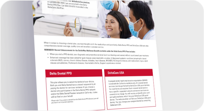 DENTAL PLANS Delta Dental and DeltaCare USA The CSU pays 100% of the monthly premium cost for dental coverage for you and your eligible dependents, including a spouse or a registered domestic partner and/or children up to age 26. For additional information, visit deltadentalins.com/csu, or call (800) 626-3108 if you are enrolled in the Delta Dental PPO Plan. Call (844) 519-8751 if enrolled in the DeltaCare USA Plan. When it comes to choosing a dental plan, you want benefts to ft the needs of you and your family. Delta Dental PPO and DeltaCare USA both offer comprehensive dental coverage, quality care and excellent customer service. REMINDER: Recent Enhancements for the SmileWay Wellness Beneft available under the Delta Dental PPO Plan includes: • When you visit a PPO dentist, your diagnostic and preventive services (such as cleanings and exams) will not count toward your maximum. • Enhanced coverage has been added for gum disease associated with a number of diagnosed systemic conditions (amyotrophic lateral sclerosis (ALS), cancer, chronic kidney disease, diabetes, heart disease, HIV/AIDS, Huntington’s disease, joint replacement, lupus, opiod misuse and addiction, Parkinson’s disease, rheumatoid arthritis, Sjogren’s syndrome or stroke). Delta Dental PPO DeltaCare USA This plan allows you to select the dentist of your choice. A prepaid dental health maintenance organization (DHMO) Both you and Delta Dental have a shared responsibility of is available for California residents only. All covered dental paying the dentist for services rendered. If you choose a services must be performed by DeltaCare USA panel dentists. dentist who participates in the Delta Dental PPO network No claim forms are required. Each covered dental service and/or the Delta Dental Premier network in California, claims has a specifc copayment amount and several services are will be fled on your behalf. covered at no charge. You will receive an identifcation card Please note: If you select a dentist from the Delta Dental PPO Network, you will and welcome letter, which lists your DeltaCare USA panel pay less in out-of-pocket expenses. dentist. The welcome letter will list your DeltaCare USA panel dentist. You may change your assigned dentist by contacting DeltaCare USA. OTHER EMPLOYER-PROVIDED BENEFITS CSU Employer-Paid Basic Life, AD&D and Long-Term Disability The CSU provides Basic Life, Accidental Death & Dismemberment (AD&D) and Long-Term Disability (LTD) to specifc employee groups at no cost through The Standard. Some components of the Basic Life insurance contain travel assistance, portability of insurance, funeral arrangements, identity theft prevention and estate planning. LTD insurance is intended to replace a portion of your income by providing a monthly beneft if you cannot work for an extended period of time because of illness or injury. 13