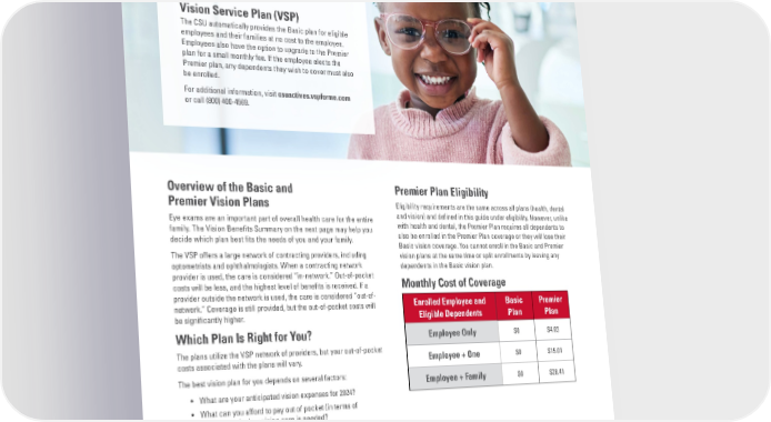 VISION PLANS The CSU’s Vision Service Plan Basic and Premier Vision Service Plan (VSP) The CSU automatically provides the Basic plan for eligible employees and their families at no cost to the employee. Employees also have the option to upgrade to the Premier plan for a small monthly fee. If the employee elects the Premier plan, any dependents they wish to cover must also be enrolled. For additional information, visit csuactives.vspforme.com or call (800) 400-4569. Overview of the Basic and Premier Plan Eligibility Premier Vision Plans Eligibility requirements are the same across all plans (health, dental Eye exams are an important part of overall health care for the entire and vision) and defned in this guide under eligibility. However, unlike family. The Vision Benefts Summary on the next page may help you with health and dental, the Premier Plan requires all dependents to decide which plan best fts the needs of you and your family. also be enrolled in the Premier Plan coverage or they will lose their Basic vision coverage. You cannot enroll in the Basic and Premier The VSP offers a large network of contracting providers, including vision plans at the same time or split enrollments by leaving any optometrists and ophthalmologists. When a contracting network dependents in the Basic vision plan. provider is used, the care is considered “in-network.” Out-of-pocket Monthly Cost of Coverage costs will be less, and the highest level of benefts is received. If a provider outside the network is used, the care is considered “out-of- Enrolled Employee and Basic Premier network.” Coverage is still provided, but the out-of-pocket costs will be signifcantly higher. Eligible Dependents Plan Plan Which Plan Is Right for You? Employee Only $0 $4.03 The plans utilize the VSP network of providers, but your out-of-pocket costs associated with the plans will vary. Employee + One $0 $15.01 The best vision plan for you depends on several factors: Employee + Family $0 $28.41 • What are your anticipated vision expenses for 2024? • What can you afford to pay out of pocket (in terms of copayments) when vision care is needed? • Do you have other vision insurance? Employee Coverage for CSU CSU and VSP provide you with a choice of affordable vision plans. You have a choice between the Basic Plan, or may upgrade to the Premier Plan for enhanced benefts. • Basic Plan: Advantage Premier Network • Premier Plan: Choice Network 11