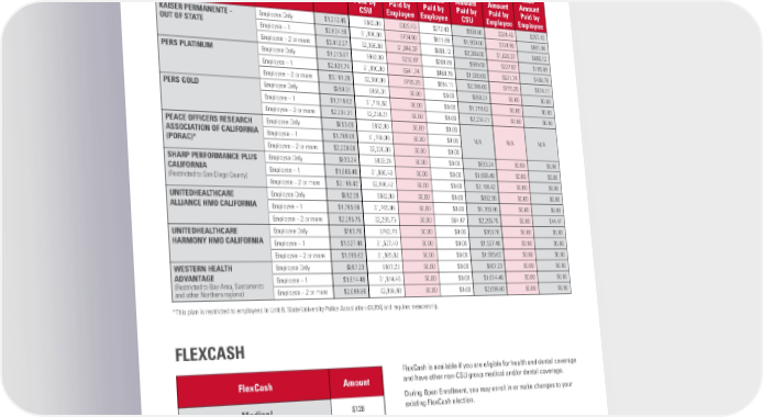 2024 CalPERS HEALTH BENEFITS PROGRAM BASIC PLAN RATES Monthly Employee Cost All Employee Groups Unit 6 Enrolled 2024 (except Unit 6) HEALTH PLAN Employee Total 2024 2024 2023 2024 2024 2023 & Eligible Monthly Amount Amount Amount Amount Amount Amount Dependents Premium Paid by Paid by Paid by Paid by Paid by Paid by CSU Employee Employee CSU Employee Employee KAISER PERMANENTE - Employee Only $1,312.45 $983.00 $329.45 $272.43 $988.00 $324.45 $267.43 OUT OF STATE Employee + 1 $2,624.90 $1,890.00 $734.90 $611.86 $1,900.00 $724.90 $601.86 Employee + 2 or more $3,412.37 $2,366.00 $1,046.37 $880.12 $2,386.00 $1,026.37 $860.12 PERS PLATINUM Employee Only $1,215.87 $983.00 $232.87 $200.89 $988.00 $227.87 $195.89 Employee + 1 $2,431.74 $1,890.00 $541.74 $468.78 $1,900.00 $531.74 $458.78 Employee + 2 or more $3,161.26 $2,366.00 $795.26 $694.11 $2,386.00 $775.26 $674.11 PERS GOLD Employee Only $859.31 $859.31 $0.00 $0.00 $859.31 $0.00 $0.00 Employee + 1 $1,718.62 $1,718.62 $0.00 $0.00 $1,718.62 $0.00 $0.00 Employee + 2 or more $2,234.21 $2,234.21 $0.00 $0.00 $2,234.21 $0.00 $0.00 PEACE OFFICERS RESEARCH Employee Only $853.00 $853.00 $0.00 $0.00 ASSOCIATION OF CALIFORNIA Employee + 1 $1,708.00 $1,708.00 $0.00 $0.00 N/A N/A N/A (PORAC)* Employee + 2 or more $2,220.00 $2,220.00 $0.00 $0.00 SHARP PERFORMANCE PLUS Employee Only $833.24 $833.24 $0.00 $0.00 $833.24 $0.00 $0.00 CALIFORNIA Employee + 1 $1,666.48 $1,666.48 $0.00 $0.00 $1,666.48 $0.00 $0.00 (Restricted to San Diego County) Employee + 2 or more $2,166.42 $2,166.42 $0.00 $0.00 $2,166.42 $0.00 $0.00 Employee Only $882.98 $882.98 $0.00 $0.00 $882.98 $0.00 $0.00 UNITEDHEALTHCARE ALLIANCE HMO CALIFORNIA Employee + 1 $1,765.96 $1,765.96 $0.00 $0.00 $1,765.96 $0.00 $0.00 Employee + 2 or more $2,295.75 $2,295.75 $0.00 $64.47 $2,295.75 $0.00 $44.47 UNITEDHEALTHCARE Employee Only $763.70 $763.70 $0.00 $0.00 $763.70 $0.00 $0.00 HARMONY HMO CALIFORNIA Employee + 1 $1,527.40 $1,527.40 $0.00 $0.00 $1,527.40 $0.00 $0.00 Employee + 2 or more $1,985.62 $1,985.62 $0.00 $0.00 $1,985.62 $0.00 $0.00 WESTERN HEALTH Employee Only $807.23 $807.23 $0.00 $0.00 $807.23 $0.00 $0.00 ADVANTAGE Employee + 1 $1,614.46 $1,614.46 $0.00 $0.00 $1,614.46 $0.00 $0.00 (Restricted to Bay Area, Sacramento and other Northern regions) Employee + 2 or more $2,098.80 $2,098.80 $0.00 $0.00 $2,098.80 $0.00 $0.00 *This plan is restricted to employees in Unit 8, State University Police Association (SUPA) and requires membership. FLEXCASH FlexCash is available if you are eligible for health and dental coverage FlexCash Amount and have other non-CSU group medical and/or dental coverage. During Open Enrollment, you may enroll in or make changes to your Medical $128 existing FlexCash election. Dental $12 Total $140 10