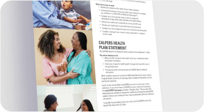 TIPS FOR SELECTING A HEALTH PLAN You may want to consider factors such as access to doctors, range of benefts, cost of services, monthly premiums, restrictions to specifc groups of doctors, referral and authorization by a primary care physician (PCP), and access to specialist or prescription drugs and restriction on a plan formulary or list of preferred drugs. Other tips to keep in mind: • Identify your needs and the needs of your family members. • Understand the basics of how your health plan’s network is managed e.g., whether it's a PPO, EPO or HMO plan (See page 7). • Consider your out-of-pocket costs, as well as copays for prescription drugs, offce visits, lab tests and hospitalization. • Review your health plan availability by county and ZIP code. • Review your health plan’s covered benefts and exclusions. • Consider any life changes that may occur during the upcoming year. • Consider coverage if you travel or have a dependent in college in another state. CALPERS HEALTH PLAN STATEMENT The CalPERS Health Plan Statement will be available online September 11, 2023. The online statement will: • Allow you 24/7 access to view and/or print your customized health enrollment information. • Inform you of specifc health beneft changes that may affect you in the upcoming year. • Provide you with direct access to all CalPERS Open Enrollment information. Other available resources include the 2024 Health Beneft Summary, Health Program Guide, Evidence of Coverage, Open Enrollment Newsletter and the health plan websites. Log in to your personalized my|CalPERS account to access your online statement. If you do not have a CalPERS account, create one by going to the my|CalPERS login page and select “Register Now.” Please note, CSU employees are not able to change their health plan through the my|CalPERS system. Contact your campus human resources/benefts offce for additional information. To identify the available plans in your area, use the CalPERS online tool, Health Plan Search by Zip Code. 5