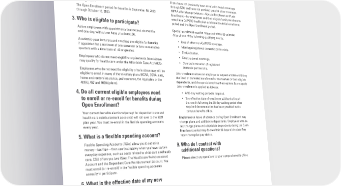 FREQUENTLY ASKED QUESTIONS 1. What is Open Enrollment? 8. What happens if I miss the Open The Open Enrollment period is the time each year when all Enrollment period or if I fail to enroll employees can enroll in benefts coverage or change their during my frst 60 days of employment current benefts coverage for the upcoming calendar year. as a new hire? 2. What are the Open Enrollment dates If you have not previously been enrolled in health coverage this year? through CSU and have not provided proof of other coverage, The Open Enrollment period for benefts is September 18, 2023 HIPAA offers two provisions—Special Enrollment and Late through October 13, 2023. Enrollment—for employees and their eligible family members to enroll in a CalPERS health plan outside of the initial enrollment 3. Who is eligible to participate? period and the Open Enrollment period. Active employees with appointments that exceed six months Special enrollment must be requested within 60 calendar and one day, with a time base of at least .50. days of one of the following qualifying events: Academic-year lecturers and coaches are eligible for benefts • Loss of other non-CalPERS coverage. if appointed for a minimum of one semester or two consecutive • Marriage/registered domestic partnership. quarters with a time base of .40 or greater. • Birth/adoption. Employees who do not meet eligibility requirements listed above • Court-ordered coverage. may qualify for health care under the Affordable Care Act (ACA). • Divorce/termination of registered domestic partnership. Employees who do not meet the eligibility criteria above may still be Late enrollment allows an employee to request enrollment if they eligible to enroll in many of the voluntary plans (HCRA, DCRA, auto, declined or canceled enrollment for themselves or their eligible home and renters insurance, pet insurance, the legal plan, or the dependents, and the special enrollment exceptions do not apply. 401(k), 457 and 403(b) plans). Late enrollment is applied as follows: 4. Do all current eligible employees need • A 90-day waiting period is required. to enroll or re-enroll for benefts during • The effective date of enrollment will be the frst of Open Enrollment? the month following the 90-day waiting period after required documentation has been provided to the Your current benefts elections (except for dependent care and campus benefts offce. health care reimbursement accounts) will roll over to the 2024 Employees on leave of absence during Open Enrollment may plan year. You must re-enroll in the fexible spending accounts change plans and add/delete dependents. Employees who do every year. not change plans and add/delete dependents during the Open Enrollment period may do so within 60 days of the date they 5. What is a fexible spending account? return to regular pay status. Flexible Spending Accounts (FSAs) allow you to set aside 9. Who do I contact with money—tax-free—then use that money when you have certain additional questions? everyday expenses, such as costs related to child care and health care. CSU offers you two FSAs: The Healthcare Reimbursement Please direct any questions to your campus benefts offce. Account and the Dependent Care Reimbursement Account. You must enroll (or re-enroll) in the fexible spending accounts annually to participate. 6. What is the effective date of my new beneft choices? The new beneft choices are effective January 1, 2024. 7. How do I fnd out if my doctor participates in CalPERS health plans? Visit calpers.ca.gov to access the Health Plan Search by ZIP Code tool to fnd doctors or medical groups in your search. Information is subject to change on a weekly basis. Before making any plan changes, contact the doctor or health plan to confrm availability. 17