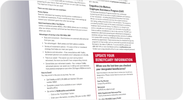 California State University (CSU) 403(b) Nationwide Pet Insurance Supplemental Retirement Plan (SRP) Whether they have two legs or four, every family member deserves The CSU provides you the opportunity to participate in the 403(b) quality health care. That’s why this pet health insurance gives you the Supplemental Retirement Plan (SRP). The SRP is a voluntary program freedom to use any vet, anywhere, including specialist and emergency that can help you save money on taxes, invest in your future and providers. Nationwide offers various beneft options for your pets. supplement your income in retirement. By contributing into the This insurance can cover your pet’s accidents, illness and even CSU 403(b) SRP, you can improve your chances of reaching your preventive care and wellness services. Plans are available for dogs, retirement goals. cats, birds, small mammals and exotics (such as reptiles). To learn more about this plan and/or to enroll, visit petinsurance.com/calstate or call Whether retirement is a long way off or right around the corner, by (877) 738-7874. participating in the CSU 403(b) SRP, you could make a big difference in Empathia Life Matters preparing for your future. Start with what you can and build from there. The important thing is that you start! Employee Assistance Program (EAP) There are two ways you can contribute: The Employee Assistance Program provides free, confdential Pretax Option counseling and referral services to eligible employees and members Save for retirement by investing monthly pretax contributions in of their household—including dependents living away from home— tax-deferred investments. Pretax contributions mean more savings go 24-hour access to confdential services that support emotional toward your retirement goals than after-tax savings. well-being, safety and productivity in the workplace. This program is provided by the CSU as part of the state’s commitment to promoting Roth Contribution (After-Tax) Option employee health and well-being. It is offered at no charge to you Unlike a traditional pretax 403(b), a Roth 403(b) allows you to contribute and is a valuable source of support and information during diffcult after-tax dollars and then withdraw tax-free dollars from your account times as well as consultations on day-to-day concerns. The EAP is an when you retire. assessment, short-term counseling and referral service designed to Advantages of saving in the CSU 403(b) SRP: assist you and your family in managing everyday concerns. In addition to in-person EAP counseling, LifeMatters offers phone counseling • Easy and convenient—Contributions are automatically deducted sessions by appointment. These sessions may be scheduled through the from your pay. program’s toll-free number and are conducted by providers located and • Tax-advantaged—Both pretax and Roth options available. licensed in the state of California. To access benefts, please call • Variety of investment options—It’s easy to fnd an investment (800) 367-7474, or visit Life Matters online at mylifematters.com. strategy that helps you meet your goals. Contact your campus benefts offce for your campus-assigned password. • Guidance and education—Free consultations with Fidelity retirement planners are available at all campuses and virtually. UPDATE YOUR • Time is an asset—The sooner you start saving toward retirement, the more you beneft from compounding interest. BENEFICIARY INFORMATION • Consolidate your retirement assets—Your campus Fidelity retirement planner can assist you in rolling over your balances When was the last time you checked from previous employers or your other CSU legacy 403(b)s accounts. your designated benefciaries? How to Enroll Open Enrollment is the ideal time to review your benefciary You may enroll in the plan at any time. You can: designations. Please review them to ensure your information • Call Fidelity at (877) 278-3699 and mention CSU plan is current. number 50537. Final Pay Warrant • Complete a paper form, available at your campus Campus Payroll Offce benefts offce. Retirement • Go online to NetBenefits.com/calstate: CalPERS my.calpers.ca.gov − Click on the “Enroll Now” button 403(b) Supplemental Retirement Plan − Enter your information, including CSU plan number 50537 Fidelity Investments netbenefits.com/calstate More Information Any other CSU 403(b) Legacy Vendor • Go to csyou.calstate.edu/srp Employer-Paid Basic Life Insurance and Accidental Death • Visit your campus benefts offce. & Dismemberment (AD&D) • CSU employees are entitled to complimentary one-on-one The Standard standard.com/mybenefts/csu consultations with a Fidelity Retirement Planner on campus. Voluntary Life Insurance, AD&D, Critical Illness and Schedule your appointment by calling (800) 642-7131 or online at Accident Insurance NetBenefits.com/calstate The Standard standard.com/mybenefits/csu • Regular review of your contributions and investment elections 401(k) and 457 keep you on track towards reaching your retirement goals. Savings Plus savingsplusnow.com 16