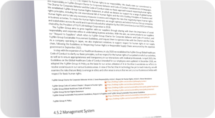 4.5 | Human Rights 4.5 Human Rights 4.5.1 Basic Approach The Fujifilm Group recognizes that respect for human rights is our responsibility. We clearly state our commitment to this responsibility in Fujifilm Group’s Charter for Corporate Behavior and Code of Conduct translated into 24 languages. The Charter for Corporate Behavior and the Code of Conduct state our basic approach toward respecting human rights. We established Fujifilm Group Human Rights Statement, in which we declare our support for a range of global human rights principles, including the UN International Bill of Human Rights and the UN’s Guiding Principles on Business and Human Rights and to take any necessary measures to assess and mitigate the risks that negatively impact human rights in business activities. To create the Human Rights Statement, we sought opinions and advice from our Group companies and stakeholders across the world and it was introduced after adoption by the CSR Committee (current ESG Committee), chaired by the President of FUJIFILM Holdings Corporation in 2018. The Fujifilm Group aims to grow together with our suppliers through sharing with them the importance of social responsibility and corporate ethics in undertaking business activities. With this aim, we communicate to our suppliers our “Request to Suppliers” which refers to Fujifilm Group Charter for Corporate Behavior and Code of Conduct, and Fujifilm Group Sustainable Procurement Guidelines, and request them to operate in line with the Charter and the Code. As a company operating in Japan, we also implement initiatives to support respect for human rights in our supply chain, following the Guidelines on Respecting Human Rights in Responsible Supply Chains announced by the Japanese government in September 2022. In step with the expansion of our healthcare business, in July 2020 we established the Fujifilm Group Global Healthcare Code of Conduct to clarify our basic principles, such as respect for the human rights of our patients in all of our activities, as well as to ensure appropriateness and transparency in our interactions with medical professionals. In April 2023, the Guidelines on the Global Healthcare Code of Conduct intended for our employees were updated. In December 2020, we adopted the Fujifilm Group AI Policy as the basis for our active utilization of AI in the drive to accelerate our efforts to resolve social issues in our various business areas. In view of the fact that AI technology has yet to reach maturity, we will examine the risks that are likely to emerge in ethics and other areas to ensure that we carry out our business activities with respect for basic human rights. Fujifilm Group Charter for Corporate Behavior Article 2. Social Responsibility, Article 3. Respect for Human Rights, Article 5. Vibrant Workplaces https://holdings.fujifilm.com/en/about/philosophy/conduct Fujifilm Group Code of Conduct Chapter 1 Respect of human rights https://holdings.fujifilm.com/en/about/philosophy/law Fujifilm Group Global Healthcare Code of Conduct https://holdings.fujifilm.com/en/sustainability/vision/policy/global-healthcare Fujifilm Group Human Rights Statement https://holdings.fujifilm.com/en/sustainability/vision/policy/statement Fujifilm Group Sustainable Procurement Guidelines, Request to Suppliers and Fujifilm Group Sustainable Procurement Guidelines https://holdings.fujifilm.com/en/sustainability/vision/policy/procurement Fujifilm Group AI Policy https://holdings.fujifilm.com/en/sustainability/vision/policy/ai 4.5.2 Management System 1. Promotion structure In the Fujifilm Group, priority issues concerning human rights and the results of measures to prevent/mitigate any violations are reported to and deliberated on by the FUJIFILM Holdings ESG Committee (chaired by the President) and then reported to the Board of Directors. The ESG Committee’s policy states clearly that “activities for identifying significant human rights issues in business activities and preventing and reducing any issues” shall be deliberated on and decided by the Committee. Resources to ensure respect for human rights are allocated by the section in question on a day-to-day basis depending on the potential impact: by Human Resources Division for issues concerning Fujifilm Group employees and by procurement divisions for issues concerning suppliers or in-plant contractors. Prior to completing a merger and acquisition or at the start of a new business involving a large investment, we assess the appropriateness of the investment by reviewing the human rights status as part of our comprehensive due diligence. 126 FUJIFILM Holdings Corporation Sustainability Report 2023