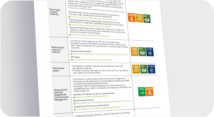 3.6 | Management of Chemical Substance Examples of Our Unique Materials and Processes that Contribute to Meeting the SDGs Materials/ Contribution SDGs Processes • A component in a device that achieves both high-speed, high- quality performance and reducing environmental load. This component allows for space-saving in the device body (50% reduction), energy consumption of the drum cartridge (the part that applies toner and prints text or images onto paper) by 60%, and production cost of drum cartridge by reducing the number of parts and its downsizing by 70%.* * Comparison on our company's multi-function devices, with conventional components as 100%. Electrically- • Received Asahi Shimbun Award and Award for Contribution to charged Invention under the National Invention Awards 2022. materials https://www.fujifilm.com/fb/company/news/release/2022/77145 • Received Asahi Shimbun Award under the National Invention Awards 2022 for Patent No. 6136862 concerning this technology. http://koueki.jiii.or.jp/hyosho/zenkoku/2022/asahi.html • Received the Minister's Prize, the Ministry of Economy, Trade and Industry under the 11th Eco Products Awards for our multifunction device that adopts this technology. https://www.jemai.or.jp/ris/award-results2014.html • Contributes to the reduction of VOC use in manufacturing. • Provides a variety of hydrophilic azo polymerization initiators and RAFT agents, enabling the manufacture of functional water-soluble Water-based polymers. polymeric Azo polymerization initiators material https://specchem-wako.fujifilm.com/jp/azo-polymerization-initiators/index.htm#water-soluble-azo-initiators RAFT agents https://specchem-wako.fujifilm.com/jp/raft/index.htm • Contributes to carbon neutrality by providing non-fossil fuel- Plant-based derived raw materials. plastic • Provides monomers derived from pine resin, which can be used as raw material for biomass plastic. • Contributes to water quality and environmental management. • Promotes the development of Certified Reference Materials (CRM) of elemental (metal) standard solutions. • Developes PFAS mixed standard solution and mixed internal Measurement standard solution used in notification and inspection methods of the Standard Water Supply Act. Reagents for Acquisition of certification for element standard solutions Environmental https://www.fujifilm.com/ffwk/ja/news/218 Management Element standard solutions https://labchem-wako.fujifilm.com/jp/category/analysis/elementalanalysis/index.html Development of PFAS mixture standard solution https://labchem-wako.fujifilm.com/jp/category/00353.html • Achieves both quality & ease of use and reducing environmental load. • To eliminate plate processors from printing along with related power, chemicals, water, and wastewater. Calculated per factory with the following essentially becoming zero Printing based on representative example: electricity: 12,600 kWh/year, materials & chemicals: 2.2 tons/year, water: 12.1 tons/year, waste liquid: 4.3 process-less tons/year. plates • Using our unique technology, improves the visibility of exposure images and the durability of plates, which used to be trade-off relationships with process-less printing. https://www.fujifilm.com/jp/ja/business/graphic/ctpplate/processless • Received Incentive Award for Research Conference Presentation in the 147th Japanese Society of Printing Science and Technology conference, 2022. 94 FUJIFILM Holdings Corporation Sustainability Report 2023