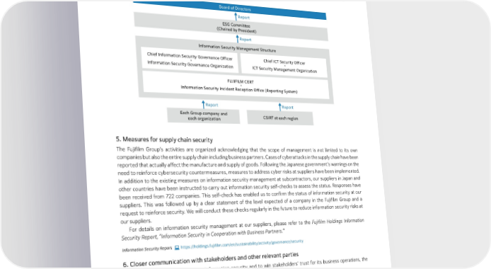 Governance 4. Development of an emergency response system to address incidents The Fujifilm Group provides a one-stop report reception office to accept reports about information security incidents and cyberattacks to promptly gather information about such incidents in a centralized manner. In the event of an incident, the ICT security management organization and the information security governance organization work together, sharing tasks, to implement measures to minimize any damage. Board of Directors Report ESG Committee (Chaired by President) Report Information Security Management Structure Chief Information Security Governance Officer Chief ICT Security Officer ・ ・ Information Security Governance Organization ICT Security Management Organization FUJIFILM CERT ・ Information Security Incident Reception Office (Reporting System) Report Report Each Group company and CSIRT at each region each organization 5. Measures for supply chain security The Fujifilm Group’s activities are organized acknowledging that the scope of management is not limited to its own companies but also the entire supply chain including business partners. Cases of cyberattacks in the supply chain have been reported that actually affect the manufacture and supply of goods. Following the Japanese government’s warnings on the need to reinforce cybersecurity countermeasures, measures to address cyber risks at suppliers have been implemented. In addition to the existing measures on information security management at subcontractors, our suppliers in Japan and other countries have been instructed to carry out information security self-checks to assess the status. Responses have been received from 722 companies. This self-check has enabled us to confirm the status of information security at our suppliers. This was followed up by a clear statement of the level expected of a company in the Fujifilm Group and a request to reinforce security. We will conduct these checks regularly in the future to reduce information security risks at our suppliers. For details on information security management at our suppliers, please refer to the Fujifilm Holdings Information Security Report, "Information Security in Cooperation with Business Partners." Information Security Report https://holdings.fujifilm.com/en/sustainability/activity/governance/security 6. Closer communication with stakeholders and other relevant parties To report on Fujifilm’s activities on information security and to win stakeholders’ trust for its business operations, the Fujifilm Group publishes an Information Security Report. FUJIFILM CERT is a member of the Forum of Incident Response and Security Teams (FIRST), the international CSIRT community, and also of the Nippon CSIRT Association, the CSIRT community in Japan. This contributes to greater security and safety in cyberspace through information exchange and coordination with other CSIRTs in Japan and other countries. 43 FUJIFILM Holdings Corporation Sustainability Report 2023