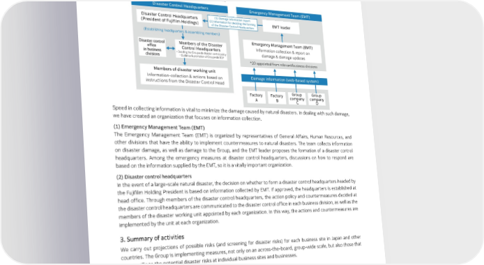 2.2 | Compliance and Risk Management maintain a continuous supply of its products and services (business continuity) while at the same time assuring safety and protecting the lives of its employees in various regions. To minimize damage to business in the event of a natural disaster, we actively work to protect against and mitigate damage from natural disasters. 2.Organization in the event of natural disasters Disaster Information-Collection Organization Disaster Control Headquarters Emergency Management Team (EMT) Disaster Control Headquarters (1) Damage information report (President of Fujifilm Holdings) (2) Information for deciding the forming EMT leader of the Disaster Control Headquarters (Establishing headquarters & assembling members) Disaster control Members of the Disaster Emergency Management Team (EMT) office Control Headquarters Information collection & report on in business Deciding the Groupwide disaster control policy damage & damage updates ・ Guidance & promotion of Groupwide BCP divisions ・ *20 appointed from relevant business divisions Members of disaster working unit Information-collection & actions based on Damage information (web-based system) instructions from the Disaster Control Head Factory Factory Group Group A B company company C D Speed in collecting information is vital to minimize the damage caused by natural disasters. In dealing with such damage, we have created an organization that focuses on information collection. (1) Emergency Management Team (EMT) The Emergency Management Team (EMT) is organized by representatives of General Affairs, Human Resources, and other divisions that have the ability to implement countermeasures to natural disasters. The team collects information on disaster damage, as well as damage to the Group, and the EMT leader proposes the formation of a disaster control headquarters. Among the emergency measures at disaster control headquarters, discussions on how to respond are based on the information supplied by the EMT, so it is a vitally important organization. (2) Disaster control headquarters In the event of a large-scale natural disaster, the decision on whether to form a disaster control headquarters headed by the Fujifilm Holding President is based on information collected by EMT. If approved, the headquarters is established at head office. Through members of the disaster control headquarters, the action policy and countermeasures decided at the disaster control headquarters are communicated to the disaster control office in each business division, as well as the members of the disaster working unit appointed by each organization. In this way, the actions and countermeasures are implemented by the unit at each organization. 3. Summary of activities We carry out projections of possible risks (and screening for disaster risks) for each business site in Japan and other countries. The Group is implementing measures, not only on an across-the-board, group-wide scale, but also those that are specific to the potential disaster risks at individual business sites and businesses. (1) Reinforcement of preparatory action The Fujifilm Group focuses on the following two important points. ① Assessment and greater visibility of disaster risks ● D isaster risks for each business site are assessed, followed by preparation of a risk map based on the information. ● In the past, individual BCPs were created per risk in different businesses. We have now integrated into the All Hazards BCP, which comprehensively covers natural disasters, infectious diseases, and information security. ② Study and preparation of countermeasures to address the assessed disaster risks ● An “action manual” is produced by each production site, specifically for that site, to address each disaster risk made visible on the disaster risk map. ● D rills on how to proceed in the event of an emergency are held based on the manual. 46 FUJIFILM Holdings Corporation Sustainability Report 2023