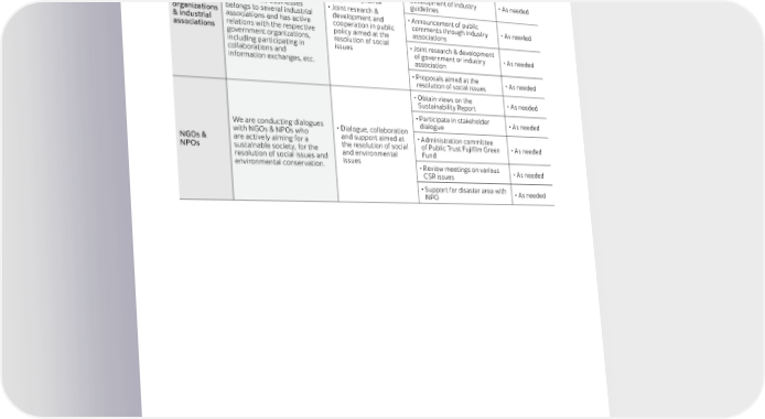 Overview Main Stakeholders Main Issues and Areas Methods of Communication Frequency of Responsibility • Participation in various • As needed industrial committees The Fujifilm Group has • Participation in the businesses in countries all over • Legal compliance development of industry • As needed the world. guidelines Government Each of these businesses • Joint research & organizations belongs to several industrial development and • Announcement of public & industrial associations and has active cooperation in public comments through industry • As needed associations relations with the respective policy aimed at the associations government organizations, resolution of social • Joint research & development including participating in issues of government or industry • As needed collaborations and association information exchanges, etc. • Proposals aimed at the • As needed resolution of social issues • Obtain views on the • As needed Sustainability Report • Participate in stakeholder • As needed We are conducting dialogues • Dialogue, collaboration dialogue with NGOs & NPOs who and support aimed at • Administration committee NGOs & are actively aiming for a the resolution of social of Public Trust Fujifilm Green • As needed NPOs sustainable society, for the and environmental Fund resolution of social issues and issues environmental conservation. • Review meetings on various • As needed CSR issues • Support for disaster area with • As needed NPO 19 FUJIFILM Holdings Corporation Sustainability Report 2023