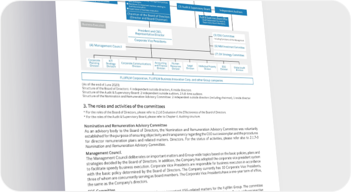 2.1 | Corporate Governance 2. Corporate Governance and Governing Structure Corporate Governance Structure General Meeting of Shareholders (1) Board of Directors (2) Nomination and Remuneration ● Determination of Group management policies Advisory Committee and strategies (3) Audit & Supervisory Board Independent Auditors ● Decisions on important matters relating to business execution ● Supervision of business execution Audit & Supervisory Board Office Chairman of the Board of Directors (Staff Department for Audit & (Director and Board Chairman) Supervisory Board Members) Business Execution President and CEO, (5) ESG Committee Representative Director Including Compliance & Risk Management Corporate Vice Presidents (6) M&A Investment Committee (4) Management Council (7) DX Strategy Committee Corporate ICT Corporate Communications Accounting Human Legal Intellectual Property ESG Global Audit Planning Strategy Division and Finance Resources Division Division Division Division Division Division Division Division FUJIFILM Corporation, FUJIFILM Business Innovation Corp. and other Group companies (As of the end of June 2023) Structure of the Board of Directors: 4 independent outside directors, 6 inside directors Structure of the Audit & Supervisory Board: 2 independent outside auditors, 2 full-time auditors Structure of the Nomination and Remuneration Advisory Committee: 2 independent outside directors (including chairman), 1 inside director 3. The roles and activities of the committees * For the roles of the Board of Directors, please refer to 2.1.6 Evaluation of the Effectiveness of the Board of Directors. * For the roles of the Audit & Supervisory Board, please refer to Chapter 4. Auditing structure. Nomination and Remuneration Advisory Committee As an advisory body to the Board of Directors, the Nomination and Remuneration Advisory Committee was voluntarily established for the purpose of ensuring objectivity and transparency regarding the CEO succession plan and the procedures for director remuneration plans and related matters. Directors. For the status of activities, please refer also to 2.1.7-3 Nomination and Remuneration Advisory Committee. Management Council The Management Council deliberates on important matters and Group-wide topics based on the basic policies, plans and strategies decided by the Board of Directors. In addition, the Company has adopted the corporate vice president system to facilitate speedy business execution. Corporate Vice Presidents are responsible for business execution in accordance with the basic policy determined by the Board of Directors. The Company currently has 10 Corporate Vice Presidents, three of whom are concurrently serving as Board members. The Corporate Vice Presidents have a one-year term of office, the same as the Company’s directors. ESG Committee The ESG Committee deliberates and decides on important ESG-related matters for the Fujifilm Group. The committee also conducts reviews and promotes basic policy development and appropriate measures from a Group-wide perspective with regard to important risks facing each Group company. The committee is chaired by the President and vice-chaired by the director responsible for ESG Division. M&A Investment Committee The M&A Investment Committee selects M&A projects that align with Group-wide management strategy and business strategy, and holds discussions to ensure M&As are conducted through the proper processes with appropriate schemes and at an appropriate price. The committee also checks on the progress of post-merger integration (PMI) after the M&A. The committee is chaired by the President and vice-chaired by the director responsible for the Corporate Planning Division. DX Strategy Committee The Company established the DX Strategy Committee as the highest decision-making body involved in promoting DX throughout the Fujifilm Group. The CEO serves as chairman and the CDO as vice-chairman. 22 FUJIFILM Holdings Corporation Sustainability Report 2023