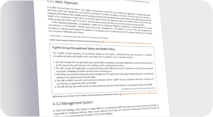 Social Aspects 4.3 Health, Safety and Wellness of Employees Definitions in this section (Chapter 4.3) ・ Fujifilm Group: FUJIFILM Holdings Corporation and its consolidated companies ・ Fujifilm Group Japan: FUJIFILM Holdings Corporation and its consolidated companies in Japan ・ Fujifilm Group Overseas: FUJIFILM Holdings Corporation and its consolidated companies outside of Japan 4.3.1 Basic Approach In Fujifilm Group Code of Conduct, the Fujifilm Group clearly states that we comply with applicable occupational health and safety laws and regulations, such as those designed to prevent workplace accidents. We also state that we aim to maintain and enhance safe, healthy and fit working environments by giving due consideration to the physical and mental health of our employees. In April 2019, we revised Fujifilm Group Occupational Safety and Health Policy to show concrete measures based on this Code of Conduct. We have been putting this idea into practice and promoting activities. In the following September, we adopted Fujifilm Group Employee Wellness Declaration to demonstrate our strong commitment to Kenkokeiei®* (health and productivity management). We believe it is one of the top managements’ priorities to maintain and enhance the wellness of employees as our employees are the foundation imperative in realizing our Corporate Philosophy and Vision. * Kenkokeiei® is a registered trademark of Nonprofit Organization Kenkokeiei. Fujifilm Group Employee Wellness Declaration and related information https://holdings.fujifilm.com/en/sustainability/vision/policy/health-safety Fujifilm Group Occupational Safety and Health Policy The Fujifilm Group operates its businesses based on this policy, considering that the promotion of workers’ occupational safety and health is the most important foundation of its corporate activities. 1. We will consider the occupational safety and health of employees including dispatched workers and contractors as the top priority, and maintain safe, healthy and fit working environments. 2. We will comply with applicable occupational safety and health laws and self-regulations, such as those designed to prevent workplace accidents and excessive working hours. 3. We will promote health and productivity management through proactively supporting employees to maintain and enhance their physical and mental health. 4. We will establish smooth communications between all the Fujifilm Group companies and their employees on promoting occupational safety and health. 5. W e will actively and continuously provide employee education and training on occupational safety and health. Established in January 2010, Revised in April 2019 Fujifilm Group Code of Conduct: Article 8, Chapter 1 Occupational Safety and Health/Health Promotion https://holdings.fujifilm.com/en/about/philosophy/law 4.3.2 Management System In FUJIFILM Holdings, ESG Division is responsible for occupational health and safety and Human Resources Division is responsible for employee wellness. Major issues related to each topic are reported to the Board of Directors through the ESG Committee chaired by the President of FUJIFILM Holdings. Promotion Structure FUJIFILM Holdings Corporation Board of Directors Report ESG Committee Chairperson: President Occupational Health and Safety Health Promotion ESG Division of Human Resources Division of FUJIFILM Holdings Corporation FUJIFILM Holdings Corporation 113 FUJIFILM Holdings Corporation Sustainability Report 2023