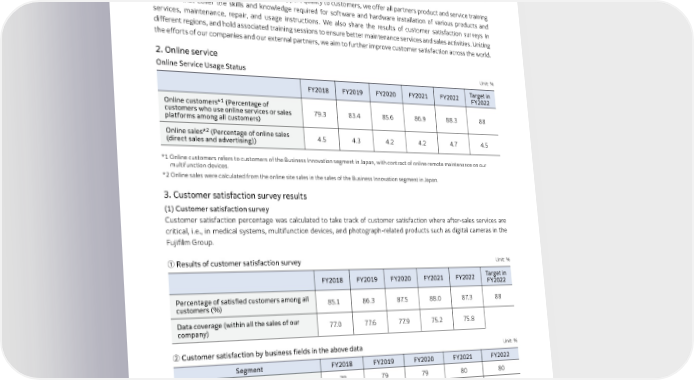 Governance 2.4.3 Efforts to Improve Customer Satisfaction 1. Education and training programs for our employees and sales distribution network The Fujifilm Group offers training not only to our own customer engineers but also to our external partners in authorized retailers to further improve our customer satisfaction. In order to deliver high and consistent support quality to customers, we offer all partners product and service training sessions that cover the skills and knowledge required for software and hardware installation of various products and services, maintenance, repair, and usage instructions. We also share the results of customer satisfaction surveys in different regions, and hold associated training sessions to ensure better maintenance services and sales activities. Uniting the efforts of our companies and our external partners, we aim to further improve customer satisfaction across the world. 2. Online service Online Service Usage Status Unit: % FY2018 FY2019 FY2020 FY2021 FY2022 Target in FY2022 1 Online customers* (Percentage of customers who use online services or sales 79.3 83.4 85.6 86.9 88.3 88 platforms among all customers) 2 Online sales* (Percentage of online sales 4.5 4.3 4.2 4.2 4.7 4.5 (direct sales and advertising)) *1 Online customers refers to customers of the Business Innovation segment in Japan, with contract of online remote maintenance on our multifunction devices. *2 O nline sales were calculated from the online site sales in the sales of the Business Innovation segment in Japan. 3. Customer satisfaction survey results (1) Customer satisfaction survey Customer satisfaction percentage was calculated to take track of customer satisfaction where after-sales services are critical, i.e., in medical systems, multifunction devices, and photograph-related products such as digital cameras in the Fujifilm Group. ① Results of customer satisfaction survey Unit: % FY2018 FY2019 FY2020 FY2021 FY2022 Target in FY2022 Percentage of satisfied customers among all 85.1 86.3 87.5 88.0 87.3 88 customers (%) Data coverage (within all the sales of our 77.0 77.6 77.9 75.2 75.8 company) ② Customer satisfaction by business fields in the above data Unit: % Segment FY2018 FY2019 FY2020 FY2021 FY2022 Healthcare (medical products) 78 79 79 80 80 Business Innovation (multifunction device 91 92 93 93 92 products) Imaging (photograph-related products such 89 89 93 93 90 as digital cameras) (2) Efforts to improve customer satisfaction In addition to initiatives at various liaison offices for customers, we improve our products and services through the views of a wide range of customers. 53 FUJIFILM Holdings Corporation Sustainability Report 2023
