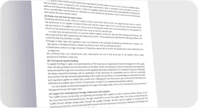 2.5 | Supply Chain Management Further, the “information security survey (self-check)” also started in fiscal 2022 for critical suppliers. In response to reports that cyberattacks on supply chains were now affecting some other companies production activity and supplies, we conducted a survey on security risk countermeasures at suppliers. The number of responding suppliers was 722. For more details on the Information Security Survey, refer to 2.2.8-5 Measures for supply chain security. (3) Request/support for supplier’s improvement activities (I) Post-self-check feedback to suppliers For all suppliers that conducted self-checks and responded to the information security survey, we sent a feedback sheet that included a score compared to the overall average (conformance rate) or evaluation level, and advice on how to address and improve any identified issues. Further, for suppliers where non-conformance was identified for high priority items, we held follow-up interviews etc. with them to understand the actual situation, ask for improvements as nessesary and confirm the improvement status. (II) Onsite visit and check by expert teams Reviewing self-check results, efforts in regard to QCD, environment and so forth, we judged that we need to conduct risk assessment on 42 suppliers located in China and Vietnam. Expert teams from our production sites provided onsite visit and check to 24 suppliers out of 42. Since some of the planned onsite visits were canceled due to the pandemic of COVID-19, the achievement rate was lower than usual, as was the case last year. In onsite visits during fiscal 2022, as usual we visited suppliers' production sites and their employee dormitories. We also inspected their labor agreements and related documents. These assessments identified the following problems and confirmed that they had been rectified. ● Changes in labor laws and regulations were not reflected in the employee handbook provided by the company. The descriptions of holiday and leave-related rules did not match with actual implementation. ● Classification marks on storage containers of hazardous wastes did not match the classification marks indicated for the storage area. We confirmed that such critical issues were improved by the end of that fiscal year for all suppliers where onsite assessments had been conducted. (III) Training and capacity building In supplier briefings in Japan, we raised awareness of the importance of appropriate chemical management in the supply chain. We also provided concrete information on the latest trends concerning procurement-related laws and regulations, and promoted thorough communications on the regulated chemicals contained (or not contained) in the procured goods. We always opened the briefings with an explanation of the importance of sustainability and our efforts in sustainable procurement. We also fostered understanding of the Fujifilm Group Charter of Corporate Behavior and Code of Conduct and requested suppliers to submit their consent form. Following on from the previous year, the fiscal 2022 briefings were held twice as a webinar due to COVID-19 restrictions. A total of 141 companies attended the webinars. For more details on chemical management throughout the supply chain, refer to 3.6.5 Contribution to Sound Chemical Management Across the Supply Chain. (IV) Support for resolving issues through collaboration with suppliers The Fujifilm Group is proactively strengthening partnerships with suppliers in order to address climate change, one of the most important international issues, through united efforts across the supply chain. Concretely, we disseminate the Fujifilm Group’s climate change policy through the supplier briefings. We also support suppliers in resolving the CSR related issues they face, such as reducing GHG emissions and reducing energy consumption, utilizing the technologies and expertise owned by FUJIFILM Engineering Co., Ltd. (4) Others (Employee education) ESG Division and Procurement & Equipment Manufacturing Division of the FUJIFILM Holdings held individual meetings several times a year with the procurement and purchasing departments of the 14 major group companies that directly procure materials. The meetings provided explanations on social demands concerning sustainable procurement and the group’s sustainable procurement activities, as well as opportunities for dialogue on initiatives and issues. Also, we provided an educational program about supply chains and human rights issues for the Group companies upon request. The program covered the rising risks related to human rights infringements across the supply chain—such as forced labor, corporations’ responsibilities, and other related topics. 62 FUJIFILM Holdings Corporation Sustainability Report 2023
