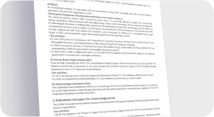 Environmental Aspects (3) Task Force for Climate-related Financial Disclosure (TCFD) An organization that advises corporations on disclosing financial information concerning climate change risks and opportunities. We announced our endorsement of the TCFD recommendations in December 2018. ● Joined the TCFD Support Project by the Ministry of the Environment in 2019. ● Joined the TCFD Consortium in 2019. ● Began disclosing environmental analyses and information based on TCFD recommendations starting with our Sustainability Report 2019. (4) RE100 An international initiative of corporations that are committed to using 100% renewable electricity for their business operations. We joined the organization in 2019. The chemical industry requires high temperature steam heat. It is extremely difficult to replace the conventional energy required for these processes with renewable energy using current technology. We are aware that acceleration of technological innovation is indispensable towards the decarbonization of electricity and energy, not only within our companies but across society as a whole. For this reason, we joined RE100 in 2019, aiming at zero CO emissions by 2050 2 through replacement with fuels without CO emissions, such as hydrogen, in addition to our renewable energy usage 2 target. In 2021, we increased the target values and brought forward the goal date to 2040. ● In June 2019 at the JCLP Symposium, the “Proposal from Corporate Consumers Aiming to Source 100% of Power from Renewable Electricity” was released based on discussions among RE100 Japanese companies. ● In 2020, in a series of seminars, “Corporate Sourcing of Renewable Energy,” jointly held by RE100 and GWEC/CDP, we presented the Fujifilm Group’s practice of renewable energy procurement. ● In March 2021, under a collaboration with JCLP, 53 of the RE100 companies submitted a letter calling for the Japanese government to increase their renewables ambitions. (5) Science-Based Targets initiative (SBTi) A partnership comprising the WWF, CDP, United Nations Global Compact, and the World Resources Institute (WRI). The initiative recommends corporations to set science-based CO emissions reduction targets to limit the global average 2 temperature rise to 1.5°C above pre-industrial levels. ● In 2017, we announced our reduction targets and obtained the official 2°C Limit validation within the same month. ● In 2020, we obtained the official Well-Below 2°C Limit validation by presenting our revised targets. (6) Japan Hydrogen Association (JH2A) This organization was established in 2020 to set up a hydrogen infrastructure and related services in Japan, to run projects for social implementation, raise hydrogen demands, and make policy proposals for easing hydrogen regulations. FUJIFILM Corporation has been a member since 2022. 2. Endorsement and support for climate change policies The Fujifilm Group announces political requests and endorsements through participating in climate change initiatives and industry organizations. ● 2019: Participated in the “Project to Support the Use of Scenario Analysis in line with TCFD recommendations” by the Ministry of the Environment. ● 2020: Participated in the Ministry of the Environment’s project to promote a decarbonized society, “Spreading Carbon Neutral – Senior Management Talks about Decarbonization” through our video. The video introduced the Fujifilm Group’s anti-climate change efforts, such as the 100% switch to wind energy in FUJIFILM Manufacturing Europe B.V. in the Netherlands in 2016, and setting group targets for renewable energy usage in 2019. ● Participating in projects by the New Energy and Industrial Technology Development Organization (NEDO), “Development of Continuous Production and Process Technologies of Fine Chemicals” and “Artificial Photosynthesis.” We were listed among the corporations under the Zero Emissions Challenge 2021, which covers companies participating in projects related to the Environment Innovation Strategy, under the Ministry of Economy, Trade and Industry. ● Keidanren Carbon Neutrality Action Plan (former Commitment to a Low Carbon Society) Cross-border voluntary efforts by the business community aiming at carbon neutrality by 2050. The plan is designed to encourage corporations to create their carbon neutrality visions and monitor their progress by undertaking checking 77 FUJIFILM Holdings Corporation Sustainability Report 2023