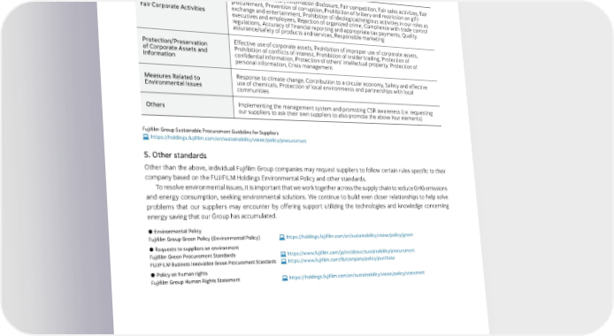 2.5 | Supply Chain Management Elements of Sustainable Procurement Guidelines for Suppliers Respect of human rights, Respect and promotion of diversity, Prohibition of Respect for Human Rights discrimination, Prohibition of bullying and harassment, Protection of privacy, Promotion of work-life balance, Prohibition of forced labor / child labor, Promotion of occupational safety and health, Respect of labor rights Active communication, Information disclosure, Fair competition, Fair sales activities, Fair procurement, Prevention of corruption, Prohibition of bribery and restriction on gift- Fair Corporate Activities exchange and entertainment, Prohibition of ideological/religious activities in our roles as executives and employees, Rejection of organized crime, Compliance with trade control regulations, Accuracy of financial reporting and appropriate tax payments, Quality assurance/safety of products and services, Responsible marketing Protection/Preservation Effective use of corporate assets, Prohibition of improper use of corporate assets, of Corporate Assets and Prohibition of conflicts of interest, Prohibition of insider trading, Protection of Information confidential information, Protection of others’ intellectual property, Protection of personal information, Crisis management Measures Related to Response to climate change, Contribution to a circular economy, Safety and effective Environmental Issues use of chemicals, Protection of local environments and partnerships with local communities Others Implementing the management system and promoting CSR awareness (i.e. requesting our suppliers to ask their own suppliers to also promote the above four elements) Fujifilm Group Sustainable Procurement Guideline for Suppliers https://holdings.fujifilm.com/en/sustainability/vision/policy/procurement 5. Other standards Other than the above, individual Fujifilm Group companies may request suppliers to follow certain rules specific to their company based on the FUJIFILM Holdings Environmental Policy and other standards. To resolve environmental issues, it is important that we work together across the supply chain to reduce GHG emissions and energy consumption, seeking environmental solutions. We continue to build even closer relationships to help solve problems that our suppliers may encounter by offering support utilizing the technologies and knowledge concerning energy saving that our Group has accumulated. ● Environmental Policy Fujifilm Group Green Policy (Environmental Policy) https://holdings.fujifilm.com/en/sustainability/vision/policy/green ● Requests to suppliers on environment Fujifilm Green Procurement Standards https://www.fujifilm.com/jp/en/about/sustainability/procurement FUJIFILM Business Innovation Green Procurement Standards https://www.fujifilm.com/fb/company/policy/purchase ● Policy on human rights Fujifilm Group Human Rights Statement https://holdings.fujifilm.com/en/sustainability/vision/policy/statement 58 FUJIFILM Holdings Corporation Sustainability Report 2023