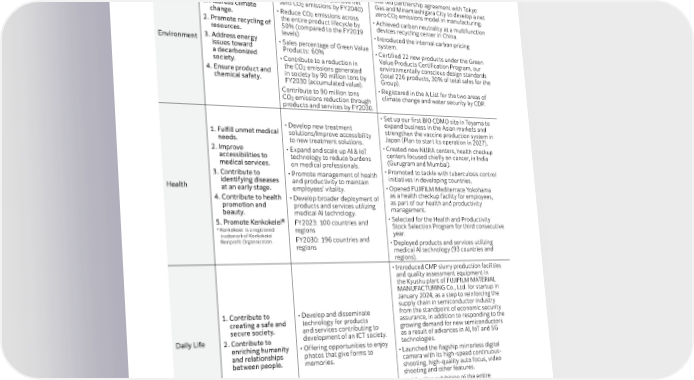 Overview 1.2.5 SVP 2030 Major Results and Activities in FY2022 Priority Area Priority Issues Major Targets for FY2022 Major Results and Activities in FY2022 *The following targets are all for FY2030. • Reduce the Fujifilm Group’s CO 2 emissions by 50% (compared to • Started partnership agreement with Tokyo the FY2019 level). (achieve net Gas and Minamiashigara City to develop a net zero CO emissions by FY2040) 2 zero CO emissions model in manufacturing. 1. Address climate • Reduce CO emissions across 2 change. 2 • Achieved carbon neutrality at a multifunction 2. Promote recycling of the entire product lifecycle by devices recycling center in China. resources. 50% (compared to the FY2019 • Introduced the internal carbon pricing levels) system. Environment 3. Address energy • Sales percentage of Green Value issues toward Products: 60% • Certified 22 new products under the Green a decarbonized • Contribute to a reduction in Value Products Certification Program, our society. the CO emissions generated environmentally conscious design standards 4. En sure product and 2 (total 226 products, 30% of total sales for the chemical safety. in society by 90 million tons by Group). FY2030 (accumulated value). • Registered in the A List for the two areas of Contribute to 90 million tons climate change and water security by CDP. CO emissions reduction through 2 products and services by FY2030. • Set up our first BIO CDMO site in Toyama to • Develop new treatment expand business in the Asian markets and 1. Fulfill unmet medical solutions/Improve accessibility strengthen the vaccine production system in needs. to new treatment solutions. Japan (Plan to start its operation in 2027). 2. Improve • Expand and scale up AI & IoT • Created new NURA centers, health checkup accessibilities to technology to reduce burdens centers focused chiefly on cancer, in India medical services. on medical professionals. (Gurugram and Mumbai). 3. Contribute to • Promote management of health • Promoted to tackle with tuberculosis control identifying diseases and productivity to maintain initiatives in developing countries. Health at an early stage. employees’ vitality. • Opened FUJIFILM Mediterrace Yokohama 4. Contribute to health • Develop broader deployment of as a health checkup facility for employees, promotion and products and services utilizing as part of our health and productivity beauty. medical AI technology. management. 5. Promote Kenkokeiei® FY2023: 100 countries and • Selected for the Health and Productivity * Kenkokeiei is a registered regions Stock Selection Program for third consecutive trademark of Kenkokeiei FY2030: 196 countries and year. Nonprofit Organaization. regions • Deployed products and services utilizing medical AI technology (93 countries and regions). • Introduced CMP slurry production facilities and quality assessment equipment in the Kyushu plant of FUJIFILM MATERIAL MANUFACTURING Co., Ltd. for startup in January 2024, as a step to reinforcing the supply chain in semiconductor industry 1. C ontribute to • Develop and disseminate from the standpoint of economic security creating a safe and technology for products assurance, in addition to responding to the secure society. and services contributing to growing demand for new semiconductors Daily Life 2. Contribute to development of an ICT society. as a result of advances in AI, IoT and 5G enriching humanity • Offering opportunities to enjoy technologies. and relationships photos that give forms to • Launched the flagship mirrorless digital between people. memories. camera with its high-speed continuous- shooting, high-quality auto focus, video shooting and other features. • Held online exhibition of the entire collection of works in The Heart to Heart Communication—“PHOTO IS” Photo Exhibition. • Acquired Smart Messaging Services Pty. Ltd., 1. C reate environments the digital messaging service company. that lead to • Create environments that • Acquired the IT service company, motivated lead to motivated workplace MicroChannel Services Pty. Limited for Work Style workplace (provision (provision of solution services). full-scale global expansion of the business of solution services). • Develop and utilize diverse launched in January 2022, namely, sales and 2. D evelop and utilize human resources. implementation support for core systems diverse human focused on Microsoft Dynamics 365. resources. • Increased ratio of female managers (from16.1% in FY2021 to 16.5% in FY2022). 13 FUJIFILM Holdings Corporation Sustainability Report 2023