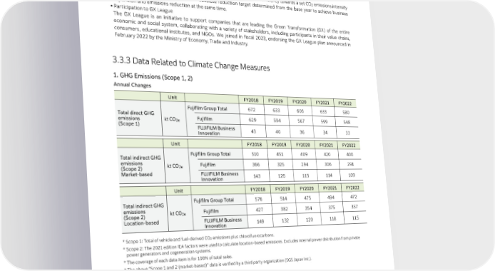 3.3 | Activities Related to Climate Change Response and assessment. We participated in the plan through the Japan Chemical Industry Association by annually reporting progress in CO emissions reduction and energy-saving measures. 2 ● We are working to reduce CO emissions by continuing our pursuit of efficient energy usage in production processes, 2 begun in the 1990s, and a gradual switch to low carbon fuels, such as natural gas, since the 2000s. ● The manufacturing industry tends to aim at optimization of production efficiency towards a set CO emissions intensity 2 target. However, we decided to set an absolute reduction target determined from the base year to achieve business expansion and emissions reduction at the same time. ● Participation to GX League The GX League is an initiative to support companies that are leading the Green Transformation (GX) of the entire economic and social system, collaborating with a variety of stakeholders, including participants in their value chains, consumers, educational institutes, and NGOs. We joined in fiscal 2023, endorsing the GX League plan announced in February 2022 by the Ministry of Economy, Trade and Industry. 3.3.3 Data Related to Climate Change Measures 1. GHG Emissions (Scope 1, 2) Annual Changes Unit FY2018 FY2019 FY2020 FY2021 FY2022 Fujifilm Group Total 672 633 603 633 580 Total direct GHG Fujifilm 629 594 567 599 548 emissions kt CO (Scope 1) 2e FUJIFILM Business 43 40 36 34 33 Innovation Unit FY2018 FY2019 FY2020 FY2021 FY2022 Total indirect GHG Fujifilm Group Total 510 451 409 420 400 emissions kt CO Fujifilm 366 325 294 306 291 (Scope 2) 2e Market-based FUJIFILM Business 143 126 115 114 109 Innovation Unit FY2018 FY2019 FY2020 FY2021 FY2022 Total indirect GHG Fujifilm Group Total 576 514 475 494 472 emissions kt CO Fujifilm 427 382 354 375 357 (Scope 2) 2e Location-based FUJIFILM Business 149 132 120 118 115 Innovation * Scope 1: Total of vehicle and fuel-derived CO emissions plus chlorofluorocarbons. 2 * Scope 2: The 2021 edition IEA factors were used to calculate location-based emissions. Excludes internal power distribution from private power generators and cogeneration systems. * The coverage of each data item is for 100% of total sales. * The above “Scope 1 and 2 (market-based)” data is verified by a third party organization (SGS Japan Inc.). 78 FUJIFILM Holdings Corporation Sustainability Report 2023