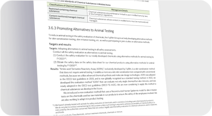 Environmental Aspects • The global chemical management system was upgraded in fiscal 2021 to improve the risk assessment accuracy for chemicals used across the Group. The system is now used as a database not only to reduce risks but also to develop technologies that contribute to solving social issues. • In fiscal 2022, we enhanced an existing system to manage chemicals contained in molded items to enable speedy and highly accurate risk assessment of our various products, some of which comprise numerous components that could reach even tens of thousands. Classification and Standards of Chemical Substances in Molded Items Classifications of Chemical Substances Management Details Restricted containing chemical Chemical substances are prohibited or limited to use in molded items by laws substances or the Company’s regulations. Content monitored/managed chemical Chemical substances whose content in molded items must be monitored and substances managed. 3.6.3 Promoting Alternatives to Animal Testing To reduce animal testing in the safety evaluation of chemicals, the Fujifilm Group is actively developing alternative methods for skin sensitization testing, skin irritation testing, etc. as well as participating in joint studies on alternative methods. Targets and results Targets: Adopting alternatives to animal testing in all safety assessments. Conduct all the safety evaluation as alternatives to animal testing. (1) Conduct the safety evaluation for our newly developed chemicals using alternative methods for animal testing by FY2025*1. (2) Obtain the safety data on the safety data sheet for our chemical products using alternative methods for animal testing by FY2030*2. Results: “Amino acid Derivative Reactivity Assay (ADRA),” exclusively developed by Fujifilm, is a skin sensitization method that does not require animal testing. It enables a more accurate skin sensitization test compared with conventional methods, because we utilize advanced chemical synthesis and molecular design technologies. ADRA was adopted in the OECD test guidelines in 2019, and is now globally recognized as a standard testing method. In 2022, we developed the evaluation method “ADRA” that can evaluate not only single chemical but also mixtures, and was newly adopted in the OECD test guidelines (OECD TG 442C). We are now considering to apply this method to chemical substances we develop in the future. We introduced a new evaluation method that uses a Reconstructed Human Epidermis model for skin irritation tests on the chemicals used as raw materials in our products to ensure the safety of the employees involved. We are also working to adopt it in product testing. *1 We haven’t already tested with animals for safety evaluation of chemicals used in cosmetics (including quasi-pharmaceutical products). We do not plan to conduct animal testing for this purpose unless such testing is required to achieve accountability of chemical safety or is instructed by the authorities concerned. Note that we conduct legally specified safety evaluation for chemical substances used in medicines and foods. *2 C hemical products: Fine chemicals, various treatment chemicals, chemicals or mixture. 3.6.4 Contribute to Resolving Social Issues through Development of New Materials and Processes The Fujifilm Group is committed to using our core technology of materials and process development to provide products and services that resolve various social issues. Targets and results Target: Contribute to resolving social issues through development of new materials and processes. Result: Disclose our exclusive materials and processes developed by our Group to contribute SDGs. 93 FUJIFILM Holdings Corporation Sustainability Report 2023