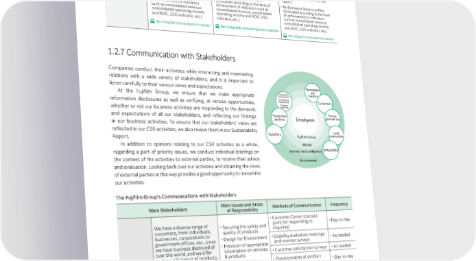 Overview Item CSR Priority Issue 1 CSR Priority Issue 2 CSR Priority Issue 3 • Overview of share-based • Overview of share-based remuneration • Overview of share-based remuneration plan for executive plan for executive officers responsible remuneration plan for executive officers responsible for Healthcare for Materials and Imaging segments in officers responsible for Business segment in 2.1.7 Executive 2.1.7 Executive Remuneration of this Innovation segment in 2.1.7 Remuneration of this report. report. Executive Remuneration of this • Performance Share Unit Plan • Performance Share Unit Plan report. Executive (Evaluated according to the level (Evaluated according to the level of • Performance Share Unit Plan Compensation of achievement of indicators achievement of indicators such as (Evaluated according to the level such as consolidated revenue, consolidated revenue, consolidated of achievement of indicators consolidated operating income operating income and ROIC, ESG such as consolidated revenue, and ROIC, ESG indicator, etc.) indicator, etc.) consolidated operating income and ROIC, ESG indicator, etc.) https://holdings.fuji昀椀lm.com/en/about/governance/compensation https://holdings.fuji昀椀lm.com/en/about/governance/compensation https://holdings.fuji昀椀lm.com/en/about/governance/compensation 1.2.7 Communication with Stakeholders Companies conduct their activities while interacting and maintaining relations with a wide variety of stakeholders, and it is important to listen carefully to their various views and expectations. Shareholders and Industrial investors At the Fujifilm Group, we ensure that we make appropriate associations Government information disclosures as well as verifying, at various opportunities, organization Customers Business whether or not our business activities are responding to the demands partners and expectations of all our stakeholders, and reflecting our findings Transaction Future partners Employees generations in our business activities. To ensure that our stakeholders’ views are reflected in our CSR activities, we also review them in our Sustainability Suppliers Local Report. Fujifilm Group communities In addition to opinions relating to our CSR activities as a whole, Market regarding a part of priority issues, we conduct individual briefings on Society (local and global) NPOs/NGOs the content of the activities to external parties, to receive their advice Environment and evaluation. Looking back over our activities and obtaining the views of external parties in this way provides a good opportunity to reexamine our activities. The Fujifilm Group’s Communications with Stakeholders Main Stakeholders Main Issues and Areas Methods of Communication Frequency of Responsibility • Customer Center (contact We have a diverse range of • Securing the safety and point for responding to • Day-to-day customers, from individuals, quality of products inquiries) businesses, corporations to • Design for Environment • Usability evaluation meetings government offices, etc., since and monitor surveys • As needed we have business deployed all • Provision of appropriate over the world, and we offer information on services • Customer satisfaction surveys • As needed Customers such a wide lineup of products, & products ranging from digital cameras • Improvement of • Questionnaires at product • Day-to-day and cosmetics to office customer satisfaction purchase printers, medical systems, levels • Showrooms, exhibitions • As needed medicine, highly functional • Customer response & materials and equipment and support • Holding seminars • As needed materials for graphic arts. • Websites and social media • As needed 17 FUJIFILM Holdings Corporation Sustainability Report 2023