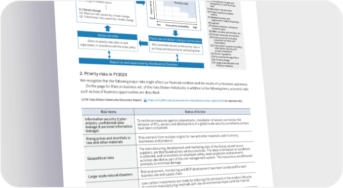 Governance Decision-making Process for Priority Risks Extracting the risks Risk assessment Risk items Risks that are likely to impact our Group The level of impact of each risk item and its (1) Impact of economic changes and (60 items in five areas) are extracted. occurrence probability are assessed quantitatively. foreign exchange fluctuations on business performance 1) Strategy risks high (2) Environmental changes and (1) Failure of new business or facility competition in each business Priority risks field investment (3) Manufacturing activities (2) Change in market needs (4) Product quality & product liability Impact level (5) Medical business and 5) Climate change regenerative medicine business (1) Physical risks caused by climate change low (6) Logistics (2) Transitional risks caused by climate change (7) Patents and other intellectual low Occurrence probability high property rights (8) M&A, business partnerships, etc. (9) Human resources recruitment (10) Internal control (including Action on risks Priority risks and decision-making on counteractions prevention of fraud and misconduct) (11) Information systems (including Action on priority risks taken at each ESG Committee decides on the priority risks in information security and organization, in accordance with the action policy our Group and the policies for addressing them. privacy protection) (12) Public regulations (13) Environmental regulations (14) Climate change (15) Large-scale disasters and Report to and supervised by the Board of Directors infectious diseases 2. Priority risks in FY2023 We recognize that the following major risks might affect our financial condition and the results of our business operations. On the page for Risks on business. etc. of the Yuka Shoken Hokokusho, in addition to the following items, economic risks such as loss of business opportunities are described. 127th Yuka Shoken Hokokusho (Securities Report) https://ir.fujifilm.com/ja/investors/ir-materials/securities-reports.html (in Japanese only) Risk Items Status of Action Information security (cyber- To reinforce measures against cyberattacks, installation of sensors to monitor the attacks, confidential data behavior of PCs, servers and development of a global scale security surveillance centers leakage & personal information have been completed. leakage) Rising prices and shortfalls in Procurement from multiple origins for raw and other materials used in priority raw and other materials businesses and products. The manufacturing, development and marketing sites of the Group, as well as our suppliers, are distributed across various countries. The latest information on conditions Geopolitical risks is collected, and instructions on employee safety, asset protection and economic activities decided as part of the risk management system. The instructions are delivered promptly to minimize damage. Large-scale natural disasters Risk assessment, monitoring and BCP development have been conducted for each business site and supply chain. Low-carbon investments are made by reducing CO emissions in the product lifecycle, Climate change risks 2 developing manufacturing methods with low environmental impact and the internal carbon pricing scheme. Reinforcement of chemical Strict regulation requirements are likely to lead to prohibition of the use of existing raw substances management materials. We recognize that PFAS control is a priority issue and plan to minimize the impact by developing substitute or alternative materials. Due to the strict restrictions and the government approval required in the healthcare Corruption and bribery business, corruption poses a high risk. Preventive measures will be strengthened, chiefly through employee education and monitoring middlemen through outside vendors. Pandemic and infectious To reduce the impact of infectious diseases spreading through the business, each diseases organization has developed its own BCP for comprehensive prevention of infection within the organization. 33 FUJIFILM Holdings Corporation Sustainability Report 2023