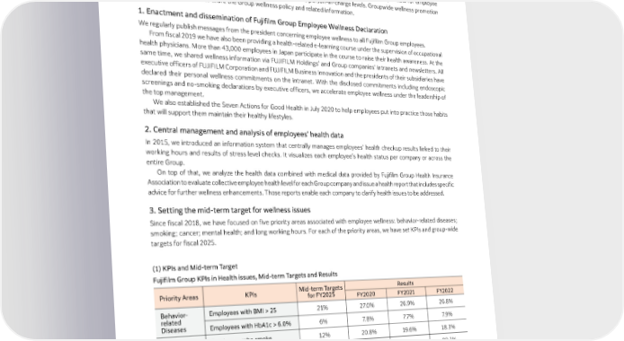 4.3 | Health, Safety and Wellness of Employees promotion initiatives. The Fujifilm Group Employee Wellness Declaration has been disseminated to all Group companies across the world, and the companies are now taking actions that most suit to their region and country. In Japan, the Group companies are working closely with the Health Insurance Association and employee organizations (labor union and employees union), and healthcare staff (occupational health physicians, health nurses, and clinical nurses) to maintain and promote employee wellness. Since fiscal 2019, we have assigned individuals responsible for employee wellness promotion in every company in Japan at the officer and person-in-charge levels. Groupwide wellness promotion meetings are organized to share the Group wellness policy and related information. 1. Enactment and dissemination of Fujifilm Group Employee Wellness Declaration We regularly publish messages from the president concerning employee wellness to all Fujifilm Group employees. From fiscal 2019 we have also been providing a health-related e-learning course under the supervision of occupational health physicians. More than 43,000 employees in Japan participate in the course to raise their health awareness. At the same time, we shared wellness information via FUJIFILM Holdings’ and Group companies’ intranets and newsletters. All executive officers of FUJIFILM Corporation and FUJIFILM Business Innovation and the presidents of their subsidiaries have declared their personal wellness commitments on the intranet. With the disclosed commitments including endoscopic screenings and no-smoking declarations by executive officers, we accelerate employee wellness under the leadership of the top management. We also established the Seven Actions for Good Health in July 2020 to help employees put into practice those habits that will support them maintain their healthy lifestyles. 2. Central management and analysis of employees’ health data In 2015, we introduced an information system that centrally manages employees’ health checkup results linked to their working hours and results of stress level checks. It visualizes each employee’s health status per company or across the entire Group. On top of that, we analyze the health data combined with medical data provided by Fujifilm Group Health Insurance Association to evaluate collective employee health level for each Group company and issue a health report that includes specific advice for further wellness enhancements. Those reports enable each company to clarify health issues to be addressed. 3. Setting the mid-term target for wellness issues Since fiscal 2018, we have focused on five priority areas associated with employee wellness: behavior-related diseases; smoking; cancer; mental health; and long working hours. For each of the priority areas, we have set KPIs and group-wide targets for fiscal 2025. (1) KPIs and Mid-term Target Fujifilm Group KPIs in Health issues, Mid-term Targets and Results Priority Areas KPIs Mid-term Targets Results for FY2025 FY2020 FY2021 FY2022 Behavior- Employees with BMI > 25 21% 27.0% 26.9% 26.8% related Diseases Employees with HbA1c > 6.0% 6% 7.8% 7.7% 7.9% Smoking Employees who smoke 12% 20.8% 19.6% 18.3% Lungs 100% 98.9% 99.4% 99.3% Stomach 100% 84.7% 81.9% 80.0% Employees Endoscope 90%+ 60.7% 59.9% 64.1% Cancer who received Large screening intestine 100% 91.5% 88.8% 89.6% Breasts 90%+ 79.7% 77.5% 80.1% Cervical 90%+ 66.9% 65.9% 67.2% Scope: Fujifilm Group employees in Japan (Screening rates for stomach and large intestine cancers are for employees aged 40 or over) 116 FUJIFILM Holdings Corporation Sustainability Report 2023