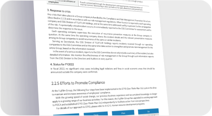 2.2 | Compliance and Risk Management Risk Items Status of Action Fires and accidents Knowledge and skills on handling chemical substances and facility safety are employed to implement measures to prevent fires and explosions. Product liability and product In the healthcare business, problems with product quality pose risks that lead to defect customers experiencing health hazards. Accidents are prevented through product design and quality assurance. Fraud by executive officers or Fraud is prevented through the development and appropriate implementation of employees internal control. Monitoring is also carried out for early detection and prevention. 3. Response to crisis Any crisis that takes place in a Group company is handled by the Compliance and Risk Management Promotion Structure (described in 2.2.3) and in accordance with our risk management regulations. When found, it is reported to each operating company and ESG Division of FUJIFILM Holdings, and at the same time addressed swiftly to prevent further propagation of the risk. If a potentially critical incident occurs, it is immediately reported to the ESG Committee for assessment and to determine the response to the issue. Each operating company supervises the execution of recurrence prevention measures at the Group company in question. At the same time the operating company shares the incident details and the relevant preventative measures among its Group companies to avoid recurrence of the same or similar incidents. Serving as Secretariat, the ESG Division of FUJIFILM Holdings reports incidents received through our operating companies to the ESG Committee and at the same time takes action to strengthen and promote risk management for the entire Group, based on the information received. In the event of a serious incident, reports to the ESG Committee do not only include a summary of the incident, but also detailed information. We monitor the effectiveness of risk management in the Group through such information reports from the ESG Division to the Directors and Auditors in every quarter. 4. Status for FY2022 In fiscal 2022, no significant crisis cases including legal violations and fines in social economic areas that should be announced outside the company were confirmed. 2.2.5 Efforts to Promote Compliance At the Fujifilm Group, the following four steps have been implemented in the STPD (See-Think-Plan-Do) cycle in the drive to maintain and increase awareness of employees’ compliance. With the growing speed of social change, our previous business experience and accumulated knowledge no longer apply to a growing range of our business activities. For this reason, the Fujifilm Group has upgraded its existing approach to PDCA and established STPD (See-Think-Plan-Do) independently to facilitate action from new perspectives. For details of our approach to STPD, please refer to 4.4.2-1. Human resource development programs. See Think Plan Do Assess conditions both inside After information analysis, Business domain-specific In addition to the annual and outside the company the key points requiring training and awareness declaration by all executive from social conditions, the reinforcement are examined. surveys are planned to officers and employees that Group's priority risks, results The awareness survey results confirm that measures are they comply with the Charter of the previous year's and trends in whistle-blowing effective. for Corporate Behavior and awareness survey, the status reports are shared for study Code of Conduct, various of risk occurrence, reports by each organization measures are implemented received by the internal throughout the Group to based on the developed improve the workplace whistle-blowing office, etc. atmosphere and give greater plans. compliance awareness. 34 FUJIFILM Holdings Corporation Sustainability Report 2023