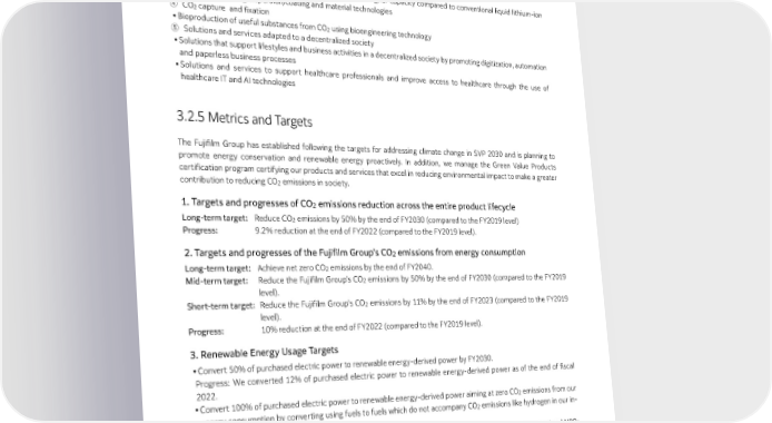 Environmental Aspects ② Energy creation ● Technology that enables inspection and diagnosis of operating wind turbine blades even in harsh environments such as windy coastal and offshore areas by combining a high-performance anti-vibration and ultra-telephoto camera that utilizes imaging and precision molding technologies with high-precision image analysis and AI technologies ③ Energy storage ● Development of semi-solid batteries with lower cost and higher capacity compared to conventional liquid lithium-ion batteries by utilizing dispersion/coating and material technologies ④ CO capture and fixation 2 ● Bioproduction of useful substances from CO using bioengineering technology 2 ⑤ Solutions and services adapted to a decentralized society ● Solutions that support lifestyles and business activities in a decentralized society by promoting digitization, automation and paperless business processes ● Solutions and services to support healthcare professionals and improve access to healthcare through the use of healthcare IT and AI technologies 3.2.5 Metrics and Targets The Fujifilm Group has established following the targets for addressing climate change in SVP 2030 and is planning to promote energy conservation and renewable energy proactively. In addition, we manage the Green Value Products certification program certifying our products and services that excel in reducing environmental impact to make a greater contribution to reducing CO emissions in society. 2 1. Targets and progresses of CO emissions reduction across the entire product lifecycle 2 Long-term target: Reduce CO emissions by 50% by the end of FY2030 (compared to the FY2019 level) 2 Progress: 9.2% reduction at the end of FY2022 (compared to the FY2019 level). 2. Targets and progresses of the Fujifilm Group’s CO emissions from energy consumption 2 Long-term target: Achieve net zero CO emissions by the end of FY2040. 2 Mid-term target: Reduce the Fujifilm Group’s CO emissions by 50% by the end of FY2030 (compared to the FY2019 2 level). Short-term target: R educe the Fujifilm Group’s CO emissions by 11% by the end of FY2023 (compared to the FY2019 2 level). Progress: 10% reduction at the end of FY2022 (compared to the FY2019 level). 3. Renewable Energy Usage Targets ● Convert 50% of purchased electric power to renewable energy-derived power by FY2030. Progress: We converted 12% of purchased electric power to renewable energy-derived power as of the end of fiscal 2022. ● Convert 100% of purchased electric power to renewable energy-derived power aiming at zero CO emissions from our 2 energy consumption by converting using fuels to fuels which do not accompany CO emissions like hydrogen in our in- 2 house cogeneration systems by FY2040. ● This target was recognized as being in line with the purpose of the RE100 by the Climate Group, an international NPO; we joined the RE100 in April 2019. 4. Targets for contribution to reducing CO emissions through products and services 2 ● Contribute to reducing accumulated 90 million tons CO emissions by FY2030. 2 75 FUJIFILM Holdings Corporation Sustainability Report 2023