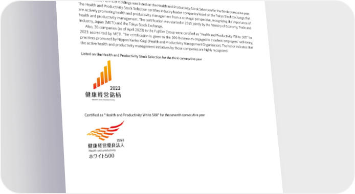 4.3 | Health, Safety and Wellness of Employees (3) Health promotion among suppliers We confirm that our suppliers have external assessment results and certificates concerning their employees’ wellness. We also provide a lecture every year for suppliers to raise health awareness among their employees by explaining the importance of employee wellness and describing our own health promotion activities. (4) Recognition In March 2023, FUJIFILM Holdings was listed on the Health and Productivity Stock Selection for the third consecutive year. The Health and Productivity Stock Selection certifies industry leader companies listed on the Tokyo Stock Exchange that are actively promoting health and productivity management from a strategic perspective, recognizing the importance of health and productivity management. The certification was started in 2015 jointly by the Ministry of Economy, Trade and Industry, Japan (METI) and the Tokyo Stock Exchange. Also, 36 companies (as of April 2023) in the Fujifilm Group were certified as “Health and Productivity White 500” for 2023 accredited by METI. The certification is given to the 500 businesses engaged in excellent employees’ well-being practices promoted by Nippon Kenko Kaigi (Health and Productivity Management Organization). The honor indicates that the active health and productivity management initiatives by those companies are highly recognized. Listed on the Health and Productivity Stock Selection for the third consecutive year Certified as “Health and Productivity White 500” for the seventh consecutive year 120 FUJIFILM Holdings Corporation Sustainability Report 2023