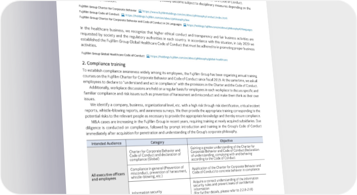 Governance 1. Charter for Corporate Behavior and Code of Conduct The Fujifilm Group reviews the Charter for Corporate Behavior and Code of Conduct in step with changes in society and business operations. Revisions are made from a global perspective, and the new versions are shared globally in all 24 languages to ensure a correct understanding by employees in each country. In July 2021, the Message from Top Management has been updated to reflect the Fujifilm Group Charter for Corporate Behavior and Code of Conduct. The employees who violate the Code of Conduct possibly become subject to disciplinary measures depending on the content of the violation. Fujifilm Group Charter for Corporate Behavior https://www.fujifilmholdings.com/en/about/philosophy/conduct/index.html Fujifilm Group Code of Conduct https://holdings.fujifilm.com/en/about/philosophy/law Fujifilm Group Charter for Corporate Behavior and Code of Conduct in 24 Languages https://holdings.fujifilm.com/en/about/philosophy#24languages In the healthcare business, we recognize that higher ethical conduct and transparency and fair business activities are requested by society and the regulatory authorities in each country. In accordance with this situation, in July 2020 we established the Fujifilm Group Global Healthcare Code of Conduct that must be adhered to in promoting proper business activities. Fujifilm Group Global Healthcare Code of Conduct https://holdings.fujifilm.com/en/about/philosophy/global-healthcare 2. Compliance training To establish compliance awareness widely among its employees, the Fujifilm Group has been organizing annual training courses on the Fujifilm Charter for Corporate Behavior and Code of Conduct since fiscal 2019. At the same time, we ask all employees to declare to “understand and act in compliance” with the provisions in the Charter and the Code of Conduct. Additionally, workplace discussions are held on a regular basis for employees in each workplace to discuss specific and familiar compliance and risk issues such as prevention of harassment and misconduct and make them think as their own issues. We identify a company, business, organizational level, etc. with a high risk through risk identification, critical incident reports, whistle-blowing reports, and awareness surveys. We then provide the appropriate training corresponding to the potential risks to the relevant people as necessary to provide the appropriate knowledge and thereby ensure compliance. M&A cases are increasing in the Fujifilm Group in recent years, requiring training at newly acquired subsidiaries. Due diligence is conducted on compliance, followed by prompt introduction and training in the Group’s Code of Conduct immediately after acquisition for penetration and understanding of the Group’s corporate philosophy. Intended Audience Category Objective Charter for Corporate Behavior and Gaining a greater understanding of the Charter for Code of Conduct and declaration of Corporate Behavior and Code of Conduct Declaration compliance (Global) of understanding, complying with and behaving according to the Code of Conduct Compliance in general (Prevention of Application of the Charter for Corporate Behavior and All executive officers misconduct, prevention of harassment, Code of Conduct to concrete behavior in compliance and employees whistle-blowing, etc.) Acquire a correct understanding of the information security rules and prevent leaks of confidential Information security information (For further details, please refer to 2.2.8-2 (4) Employee training) All executive officers and employees Global Healthcare Code of Conduct Study of the Code of Conduct and laws and regulations in the healthcare and Healthcare Compliance related to the healthcare business to prevent violations. business New employees (New executive Establish awareness of compliance and risk officers, new Compliance and risk management in management pertaining to each employee’s job level managerial general and function, to assure appropriate behavior. personnel, new general employees) 35 FUJIFILM Holdings Corporation Sustainability Report 2023