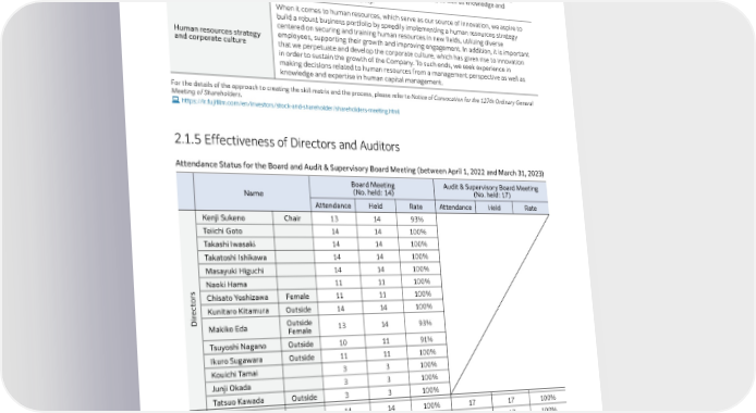 Governance Skill Reason for Selection We aspire to achieve objectives particularly with respect to long-term CSR and medium- term management plans. We also aspire to assess whether our trajectory and outcomes Sustainability align with social trends and the medium- to long-term value sought by society in order to improve our corporate value. To such ends, we seek experience in striking a balance between economic value and social/environmental value, as well as knowledge and expertise related to sustainability. When it comes to human resources, which serve as our source of innovation, we aspire to build a robust business portfolio by speedily implementing a human resources strategy centered on securing and training human resources in new fields, utilizing diverse Human resources strategy employees, supporting their growth and improving engagement. In addition, it is important and corporate culture that we perpetuate and develop the corporate culture, which has given rise to innovation in order to sustain the growth of the Company. To such ends, we seek experience in making decisions related to human resources from a management perspective as well as knowledge and expertise in human capital management. For the details of the approach to creating the skill matrix and the process, please refer to Notice of Convocation for the 127th Ordinary General Meeting of Shareholders. https://ir.fuji昀椀lm.com/en/investors/stock-and-shareholder/shareholders-meeting.html 2.1.5 Effectiveness of Directors and Auditors Attendance Status for the Board and Audit & Supervisory Board Meeting (between April 1, 2022 and March 31, 2023) Board Meeting Audit & Supervisory Board Meeting Name (No. held: 14) (No. held: 17) Attendance Held Rate Attendance Held Rate Kenji Sukeno Chair 13 14 93% Teiichi Goto 14 14 100% Takashi Iwasaki 14 14 100% Takatoshi Ishikawa 14 14 100% Masayuki Higuchi 14 14 100% s Naoki Hama 11 11 100% r Chisato Yoshizawa Female 11 11 100% o t c Kunitaro Kitamura Outside 14 14 100% e ir D Makiko Eda Outside 13 14 93% Female Tsuyoshi Nagano Outside 10 11 91% Ikuro Sugawara Outside 11 11 100% Kouichi Tamai 3 3 100% Junji Okada 3 3 100% Tatsuo Kawada Outside 3 3 100% s Nobuo Hanada 14 14 100% 17 17 100% r Motoko Kawasaki Female 14 14 100% 17 17 100% to di Masataka Outside 14 14 100% 17 17 100% u Mitsuhashi A Tatsuya Inagawa Outside 14 14 100% 17 17 100% * Naoki Hama, Chisato Yoshizawa, Tsuyoshi Nagano and Ikuro Sugawara were appointed directors on June 29, 2022. Number of attendance of Meeting were counted after their appointments. * Kouichi Tamai, Junji Okada and Tatsuo Kawada were resigned from directors on June 26, 2022. Number of attendance of Meeting were counted before their resignations. 25 FUJIFILM Holdings Corporation Sustainability Report 2023