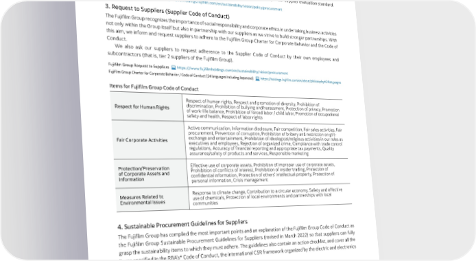 Governance 2. Fujifilm Group Procurement Policy Fujifilm Group upholds the Fujifilm Group’s Procurement Policy as a group-wide policy. We believe it is important that the business partners and suppliers, especially production materials suppliers, understand the importance of initiatives from the viewpoint of CSR, such as environment, human rights, occupational health and safety, corporate ethics, etc. and work together with us in resolving issues. Therefore, we include the aspects of sustainability in our supplier evaluation standard. Fujifilm Group Procurement Policy https://holdings.fujifilm.com/en/sustainability/vision/policy/procurement 3. Request to Suppliers (Supplier Code of Conduct) The Fujifilm Group recognizes the importance of social responsibility and corporate ethics in undertaking business activities not only within the Group itself but also in partnership with our suppliers as we strive to build stronger partnerships. With this aim, we inform and request suppliers to adhere to the Fujifilm Group Charter for Corporate Behavior and the Code of Conduct. We also ask our suppliers to request adherence to the Supplier Code of Conduct by their own employees and subcontractors (that is, tier 2 suppliers of the Fujifilm Group). Fujifilm Group Request to Suppliers https:///www.fujifilmholdings.com/en/sustainability/vision/procurement Fujifilm Group Charter for Corporate Behavior / Code of Conduct [24 languages including Japanese] https://holdings.fujifilm.com/en/about/philosophy#24languages Items for Fujifilm Group Code of Conduct Respect of human rights, Respect and promotion of diversity, Prohibition of Respect for Human Rights discrimination, Prohibition of bullying and harassment, Protection of privacy, Promotion of work-life balance, Prohibition of forced labor / child labor, Promotion of occupational safety and health, Respect of labor rights Active communication, Information disclosure, Fair competition, Fair sales activities, Fair procurement, Prevention of corruption, Prohibition of bribery and restriction on gift- Fair Corporate Activities exchange and entertainment, Prohibition of ideological/religious activities in our roles as executives and employees, Rejection of organized crime, Compliance with trade control regulations, Accuracy of financial reporting and appropriate tax payments, Quality assurance/safety of products and services, Responsible marketing Protection/Preservation Effective use of corporate assets, Prohibition of improper use of corporate assets, of Corporate Assets and Prohibition of conflicts of interest, Prohibition of insider trading, Protection of Information confidential information, Protection of others’ intellectual property, Protection of personal information, Crisis management Measures Related to Response to climate change, Contribution to a circular economy, Safety and effective Environmental Issues use of chemicals, Protection of local environments and partnerships with local communities 4. Sustainable Procurement Guidelines for Suppliers The Fujifilm Group has compiled the most important points and an explanation of the Fujifilm Group Code of Conduct as the Fujifilm Group Sustainable Procurement Guidelines for Suppliers (revised in March 2022) so that suppliers can fully grasp the sustainability items to which they must adhere. The guidelines also contain an action checklist, and cover all the items specified in the RBA’s* Code of Conduct, the international CSR framework organized by the electric and electronics industry. *RBA: Responsible Business Alliance 57 FUJIFILM Holdings Corporation Sustainability Report 2023