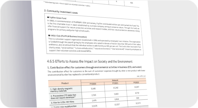 4.6 | Corporate Citizenship Monetary value of Social Contribution Activities in the Fujifilm Group in FY2022 Unit: million yen Volunteering Operation Cost/ Cash Goods Cost* Other Expenses, etc. Types of Social Contribution 530 73 6 426 (converted into money) * Volunteering cost = Hours spent on volunteer activities × salary 2. Community investment cases ● Fujifilm Green Fund In 1983, in commemoration of FUJIFILM’s 50th anniversary, Fujifilm contributed a billion yen and started this Fund. This is the first charitable trust in Japan established by a private company aiming to preserve nature. Through this fund, we offer financial support for nature protection activities and research bodies, and host nature protection awareness raising programs for primary and junior high school pupils. ● HASU-Club (FUJIFILM Business Innovation) This is a volunteer support organization established in 1991 and operated by employees’ own initiative. The organization is funded through the payroll giving by the employees who opted to donate a fraction (less than 100 yen) of their salary and bonus, plus an amount that the individual wishes to add monthly as 100 yen per unit. The fund is then reserved in four charity areas; “social welfare,” “culture and education,” “natural environment,” “international aid,” chosen by employees to support their volunteer activities and related NPOs. 4.6.5 Efforts to Assess the Impact on Society and the Environment 1. Contribution effect for customers through environmental activities in business (CO and water) 2 The contribution effect for customers is the sum of customers’ expenses brought by when a new product with lower environmental burden has replaced a conventional product. Unit: million yen Product Amount FY2020 FY2021 FY2022 1. High-density magnetic 9,148 13,242 11,007 memory materials 2. Processless CTP plate that 2,516 5,660 4,732 does not require developer* 3. Film for LCDs: WV films 2,476 1,964 934 4. Digital color multifunction 13,635 12,027 12,573 device and printers Total 27,774 32,893 29,246 * Values presented are rounded and the sums of the items do not always make up the totals. 136 FUJIFILM Holdings Corporation Sustainability Report 2023