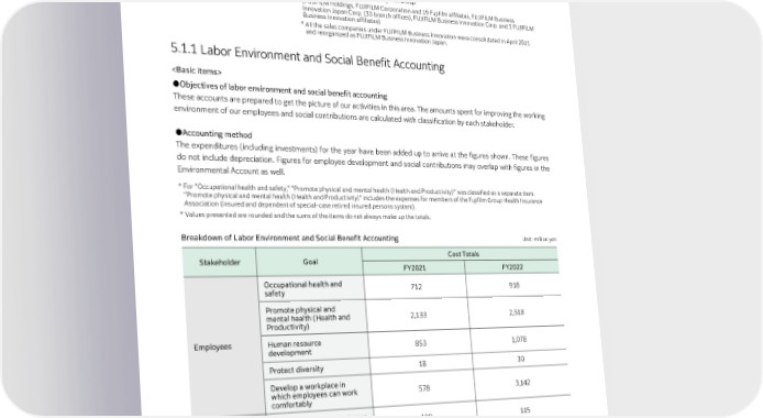 Sustainability Accounting 5. S ustainability Accounting (Labor Environment and Social Benefit Accounting, Environmental Accounting) ・Fiscal 2022 (April 1, 2022 to March 31, 2023) ・28 domestic companies in the Fujifilm Group (FUJIFILM Holdings, FUJIFILM Corporation and 19 Fujifilm affiliates, FUJIFILM Business Innovation Japan Corp. (33 branch offices), FUJIFILM Business Innovation Corp. and 5 FUJIFILM Business Innovation affiliates) * All the sales companies under FUJIFILM Business Innovation were consolidated in April 2021 and reorganized as FUJIFILM Business Innovation Japan. 5.1.1 Labor Environment and Social Benefit Accounting ●Objectives of labor environment and social benefit accounting These accounts are prepared to get the picture of our activities in this area. The amounts spent for improving the working environment of our employees and social contributions are calculated with classification by each stakeholder. ●Accounting method The expenditures (including investments) for the year have been added up to arrive at the figures shown. These figures do not include depreciation. Figures for employee development and social contributions may overlap with figures in the Environmental Account as well. * For “Occupational health and safety,” “Promote physical and mental health (Health and Productivity)” was classified as a separate item. “Promote physical and mental health (Health and Productivity)” includes the expenses for members of the Fujifilm Group Health Insurance Association (insured and dependent of special-case retired insured persons system). * Values presented are rounded and the sums of the items do not always make up the totals. Breakdown of Labor Environment and Social Benefit Accounting Unit: million yen Stakeholder Goal Cost Totals FY2021 FY2022 Occupational health and 712 918 safety Promote physical and mental health (Health and 2,133 2,518 Productivity) Employees Human resource 853 1,078 development Protect diversity 18 30 Develop a workplace in which employees can work 578 3,142 comfortably Customers Ensure appropriate customer 180 115 response and safety Future Education for future 120 162 generations generations Harmony with the local 96 132 Communities community (local society and government) Promote culture and the arts 423 442 in society (in Japan) International Consideration for the community international community and 152 79 international cultures 139 FUJIFILM Holdings Corporation Sustainability Report 2023