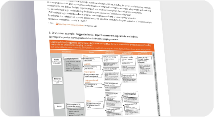 Social Aspects 2.Socialimpactassessmentofsocialcontribution In 2018, FUJIFILM Business Innovation worked to “visualize” its social contribution activities in order to understand their social significance, results, and effects and make them improve. We will continue to carry out impact assessments regularly to clarify and improve our activities. [Implementation method] To evaluate the social impact from our major social contribution activities, including the project to offer learning materials in emerging countries and reproduction and utilization of historical documents, we created a logic model and made trial assessments. We did not find any negative impact on a local community from the result of trial assessments. (1) Considering a logic model utilizing the Social Impact Assessment Tool Set created by GSG.* (2) Creating a logic model based on a program evaluation approach and a review by Meiji University. To enhance the reliability of our own assessments, we asked the Institute for Program Evaluation of Meiji University to review our assessment results in FY2017. * GSG: http://impactinvestment.jp/about/ (in Japanese only) 3. Discussion example: Suggested social impact assessment logic model and indices (1) Project to provide learning materials for children in emerging countries Logic model and suggested performance indicators for FUJIFILM Business Innovation’s “project to provide learning materials for children in emerging countries” Multi-sector collaboration aimed at distributing learning materials to some 100,000 children by 2023 to rectify disparity of educational opportunities in emerging countries Initial outcome Interim outcome Final outcome V Inputs/activities Outputs (Direct objective) (Operation objective) (Higher-order objective) ision: Contributing to r Children Feeling the joy of learning Higher academic capability Children can choose a People Distributing learning materials Increased learning • Increased motivation • Higher basic knowledge / future path they desire • Number of learning materials opportunities to learn skills (higher education/ Staff, employees distributed Number of positive responses in • Increased enthusiasm for employment) as volunteers Local NGOs surveys (level of interest in/ higher education • Number of children who enthusiasm for study) • Enrollment status: Junior high • Exam scores schools, senior high schools, receive learning materials Increased partners for • Number of positive responses in universities edr • Types of learning materials their activities Higher name value/reputation surveys (enthusiasm for higher • Number/ratio of children who distributed in local communities education) have enrolled: Junior high ess the disparity of educational opportunities among childr Financial sponsors schools, senior high schools, • Number of partners for the project universities Having their company names • Number of media reports on the • Employment rate appear in learning materials project Greater connection with • Number of positive responses in local communities Materials surveys (level of recognition/ Printing devices, Local communities and reputation in local communities) Number of people participating in paper residents local activities (various projects, Greater interest/awareness/ events, etc.) Becoming aware of emphasis on children the activities Number of positive responses in surveys (level of interest/ awareness) Heightened self respect/ Improved school attendance dignity and established study habit • Heightened self esteem at home • Heightened sense of Number of positive responses in Children empowerment surveys (attendance status, study Monitoring/mentoring Increased opportunities Number of positive responses in surveys hours/frequency at home) Money (mentality score given on self esteem and (children and parents) to get associated with sense of empowerment/ Heightened sense of trust adults mentality about future) in society • Number of children who have received mentoring/ Capable of considering personal • Establishing a sense of en in the Asia P monitoring goals and the future engagement in social issues • Number of employees who Number of positive responses in Number of positive responses in joined the activities as surveys (score given on mentality surveys (score given on the sense volunteers about the future) of trust in society) Guardians Increased opportunities to Heightened understanding Established environment that acific r think about children’s about the importance of facilitates children’s learning study for young children education Number of positive responses in surveys Number of positive responses in egion (level of awareness about the importance surveys (level of improvement in of children’s education) children’s learning environment) * This shows a logic model and suggested performance indicators for social impact measurement as of June 2018. 137 FUJIFILM Holdings Corporation Sustainability Report 2023