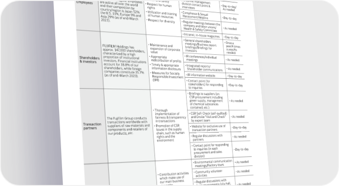 1.2 | CSR Management Main Stakeholders Main Issues and Areas Methods of Communication Frequency of Responsibility • Providing opportunities for dialogue with top • As needed Employees working for the management Fujifilm Group total approx. • Ensuring occupational • Personnel management • Day-to-day/ 83,000 people in 273 health and safety division contact point & As needed companies. Regular employees • Respect for human interviews Employees are active all over the world rights and their composition by • Utilization and training • Compliance & Sexual • Day-to-day country/region is Japan 52% of human resources Harassment Helpline the U.S. 11%, Europe 9% and • Regular meetings between the Asia 29% (as of end-March • Respect for diversity company and labor unions/ • As needed 2023). Health & Safety Committee • Intranet; in-house magazines • Day-to-day • General shareholders • Once a meetings/Business report year/4 times • Maintenance and briefings/Briefings for a year/As FUJIFILM Holdings has expansion of corporate investors needed approx. 147,000 shareholders, value • IR conferences/Individual characterized by a high • Appropriate meetings • As needed Shareholders proportion of institutional redistribution of profits & investors investors. Financial institutions • Timely & appropriate • Integrated reports/ account for 38.8% of our information disclosure Shareholder communications • As needed shareholders, while foreign companies constitute 35.7% • Measures for Socially • IR information website • Day-to-day (as of end-March 2023). Responsible Investment (SRI) • Contact point (for stakeholders) for responding • Day-to-day to inquiries • Briefings to suppliers (on CSR procurement including green supply, management • As needed of chemical substances • Thorough contained, etc.) implementation of • CSR Self-Check (self-audited) The Fujifilm Group conducts fairness & transparency and Onsite “Visit and Check” • As needed Transaction transactions worldwide with in transactions by expert team partners suppliers of raw materials and • Promotion of CSR • Website for exclusive use of components and retailers of issues in the supply transaction partners • Day-to-day our products, etc. chain, such as human rights and the • Regular discussions with • As needed environment partners • Contact point for responding to inquiries (in each • Day-to-day procurement and sales division) • Environmental communication • As needed meetings/Factory tours • Contribution activities • Community volunteer • As needed which make use of activities our main business • Regular discussions with The Fujifilm Group has bases strengths local governments (city hall, in approx. 40 countries across • Respecting local mayor, community association • As needed Future the world and conducts its culture & customs presidents, etc.) generations activities by treating the local and environmental & local culture and customs with conservation • Contact point (at each factory • Day-to-day societies respect, as well as putting • Prevention of disasters & office) efforts into educational and accidents in the support for future generations. workplace • Dispatch of lecturers to the • Educational support for academic organization & • As needed future generations endowed chairs • Environmental education activities in cooperation with • As needed NGOs & NPOs 18 FUJIFILM Holdings Corporation Sustainability Report 2023