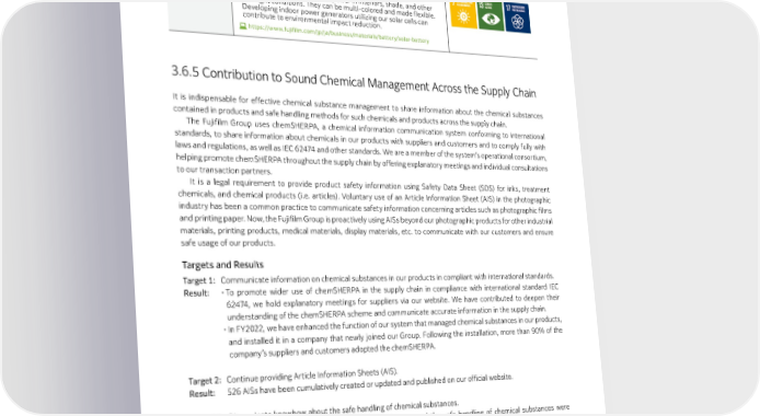 Environmental Aspects Materials/ Contribution SDGs Processes • Solar cells that can contribute to creation of a next-generation renewable energy power generator that does not require batteries or utility power. Dye for dye Compared with conventional silicon solar cells, dye-sensitized sensitized solar solar cells can generate more power in interiors, shade, and other cell low-light conditions. They can be multi-colored and made flexible. Developing indoor power generators utilizing our solar cells can contribute to environmental impact reduction. https://www.fujifilm.com/jp/ja/business/materials/battery/solar-battery 3.6.5 Contribution to Sound Chemical Management Across the Supply Chain It is indispensable for effective chemical substance management to share information about the chemical substances contained in products and safe handling methods for such chemicals and products across the supply chain. The Fujifilm Group uses chemSHERPA, a chemical information communication system conforming to international standards, to share information about chemicals in our products with suppliers and customers and to comply fully with laws and regulations, as well as IEC 62474 and other standards. We are a member of the system’s operational consortium, helping promote chemSHERPA throughout the supply chain by offering explanatory meetings and individual consultations to our transaction partners. It is a legal requirement to provide product safety information using Safety Data Sheet (SDS) for inks, treatment chemicals, and chemical products (i.e. articles). Voluntary use of an Article Information Sheet (AIS) in the photographic industry has been a common practice to communicate safety information concerning articles such as photographic films and printing paper. Now, the Fujifilm Group is proactively using AISs beyond our photographic products for other industrial materials, printing products, medical materials, display materials, etc. to communicate with our customers and ensure safe usage of our products. Targets and Results Target 1: Communicate information on chemical substances in our products in compliant with international standards. Result: • To promote wider use of chemSHERPA in the supply chain in compliance with international standard IEC 62474, we hold explanatory meetings for suppliers via our website. We have contributed to deepen their understanding of the chemSHERPA scheme and communicate accurate information in the supply chain. • In FY2022, we have enhanced the function of our system that managed chemical substances in our products, and installed it in a company that newly joined our Group. Following the installation, more than 90% of the company’s suppliers and customers adopted the chemSHERPA. Target 2: C ontinue providing Article Information Sheets (AIS). Result: 526 AISs have been cumulatively created or updated and published on our official website. Target 3: Disseminate knowhow about the safe handling of chemical substances. Result: • Training programs for chemical laws and regulations, and the safe handling of chemical substances were organized for all the divisions involved in Fujifilm Group’s chemical lifecycle (procurement, R&D, manufacturing, sales and disposal) in Japan. The program is given by an expert from FUJIFILM Wako Pure Chemical who holds specialized seminars outside the Company. • In line with the Industrial Safety and Health Act and our internal regulations, we established a policy to appoint a chemical manager within every business division that handles, sells, or provides chemicals, in Japan. We are now creating an education program for chemical managers who can assist in managing chemical safety for our employees and customers. 95 FUJIFILM Holdings Corporation Sustainability Report 2023