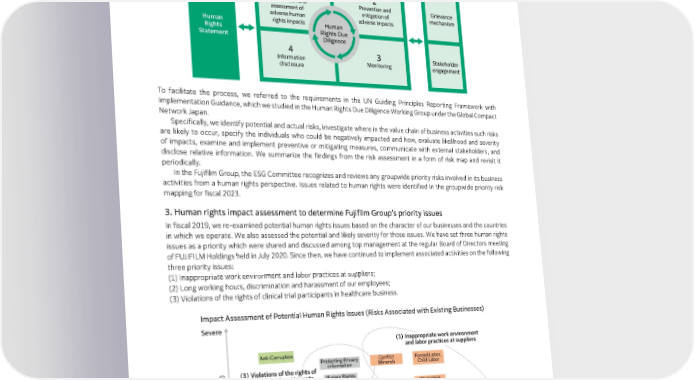 Social Aspects 2. Human rights due diligence process The Fujifilm Group has implemented a human rights due diligence process in accordance with the procedures set out in the UN Guiding Principles on Business and Human Rights, covering all business activities we are operating or involved in. 1 2 Identification and Prevention and Grievance assessment of mitigation of mechanism adverse human adverse impacts Human rights impacts Human Rights Rights Due Statement Diligence 4 3 Stakeholder Information Monitoring engagement disclosure To facilitate the process, we referred to the requirements in the UN Guiding Principles Reporting Framework with Implementation Guidance, which we studied in the Human Rights Due Diligence Working Group under the Global Compact Network Japan. Specifically, we identify potential and actual risks, investigate where in the value chain of business activities such risks are likely to occur, specify the individuals who could be negatively impacted and how, evaluate likelihood and severity of impacts, examine and implement preventive or mitigating measures, communicate with external stakeholders, and disclose relative information. We summarize the findings from the risk assessment in a form of risk map and revisit it periodically. In the Fujifilm Group, the ESG Committee recognizes and reviews any groupwide priority risks involved in its business activities from a human rights perspective. Issues related to human rights were identified in the groupwide priority risk mapping for fiscal 2023. 3. Human rights impact assessment to determine Fujifilm Group’s priority issues In fiscal 2019, we re-examined potential human rights issues based on the character of our businesses and the countries in which we operate. We also assessed the potential and likely severity for those issues. We have set three human rights issues as a priority which were shared and discussed among top management at the regular Board of Directors meeting of FUJIFILM Holdings held in July 2020. Since then, we have continued to implement associated activities on the following three priority issues: (1) Inappropriate work environment and labor practices at suppliers; (2) Long working hours, discrimination and harassment of our employees; (3) Violations of the rights of clinical trial participants in healthcare business. Impact Assessment of Potential Human Rights Issues (Risks Associated with Existing Businesses) Severe (1) Inappropriate work environment and labor practices at suppliers Anti-Corruption Protecting Privacy Conflict Forced Labor, (3) Violations of the rights of information Minerals Child Labor clinical trial participants Human Rights in healthcare business of Patients Workplace Environmental Safety Conservation Long Working Social Security Hours Protecting Privacy Long Working information Hours Discrimination, Discrimination, Discrimination Freedom of Harassment Harassment Severity (scale, scope)Supplier Association Company Product Safety Workplace Employees Safety Consumer (2) Long working hours, discrimination Community and harassment of our employees Mild Low Likelihood High 127 FUJIFILM Holdings Corporation Sustainability Report 2023